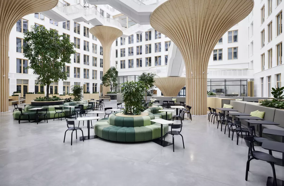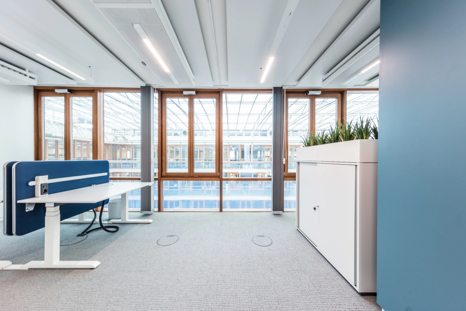 The atrium hall was equipped with specially manufactured displacement ventilation columns. This SLT special solution consisted of displacement air units in the lower area as well as jet nozzles in the upper area of the column. The ventilation elements were clad with a wooden structure and thus integrated into the theme of sustainability. This product ensures the supply of fresh air in the near and far areas of the diffuser and thus ensures a complete supply of fresh air to the occupied zone.