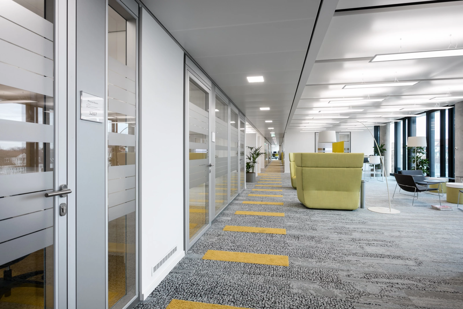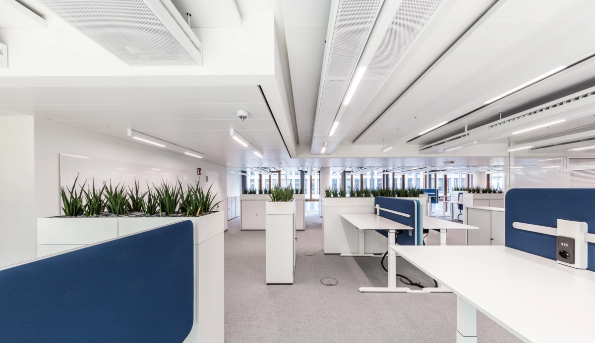 SLT has developed a unique design for ceiling induction units, adapting the DIAF and DIA-HF in large quantities for the refurbishment of an office building on the Neue Mainzer Strasse in Frankfurt, air conditioning several floors, serving a total of approx. 8,000 m² of office space. The newly developed units are made up of a series of sections with a total length of up to 3900 mm. Running alongside the induction function of the product are integrated LED lighting fixtures and sound-absorbing sail surfaces.​​