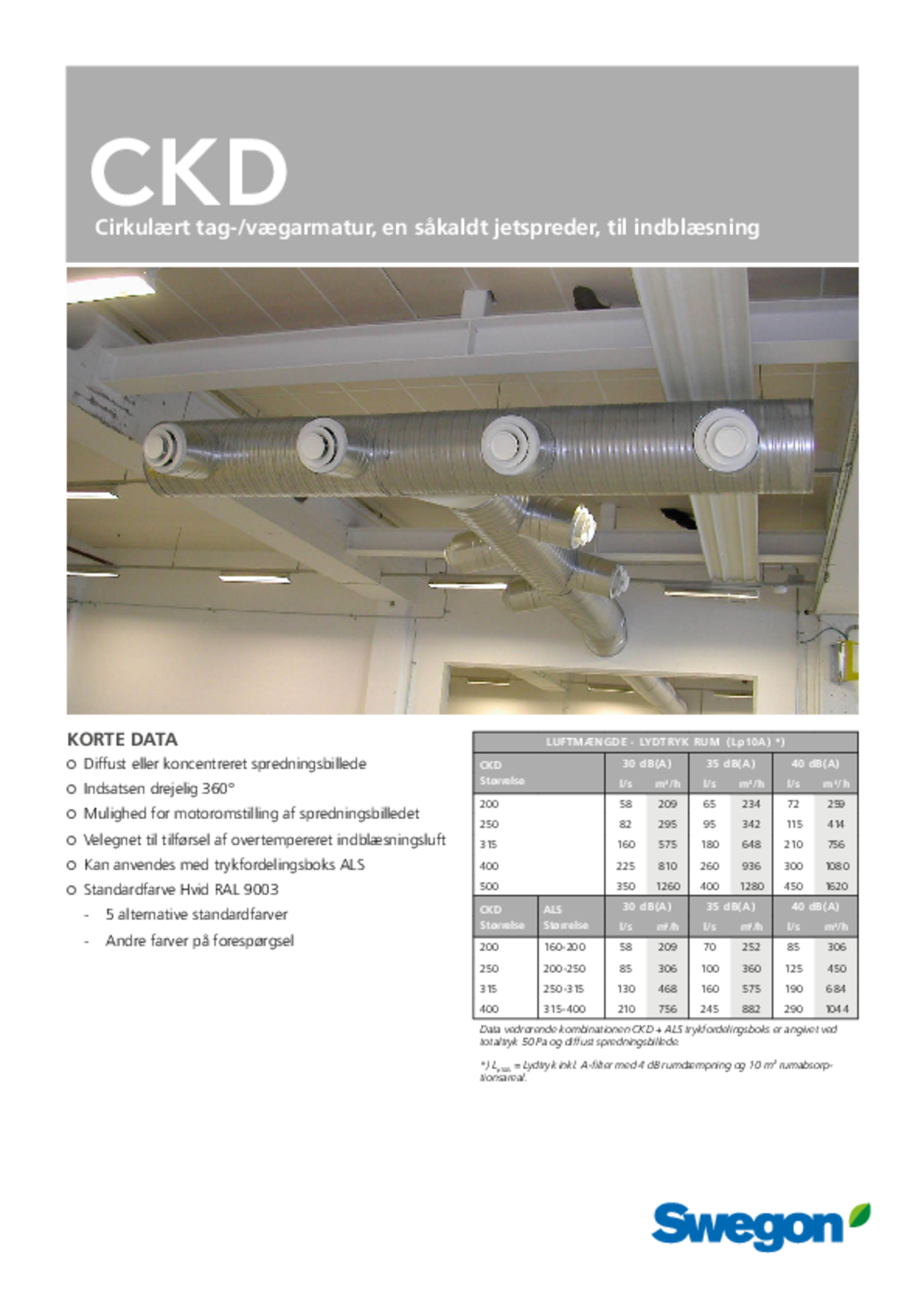 CKD er en cirkulær flerkonus-jetdyse til væg- eller loftmontering. Kan håndtere ekstremt store luftmængder ved lavt lydniveau. Velegnet til konstant eller variabel luftmængde. Kan benyttes til under- eller overtemperatur, og både vandret og lodret spredningsbillede er muligt. Velegnet til både komfort- og industrianlæg.