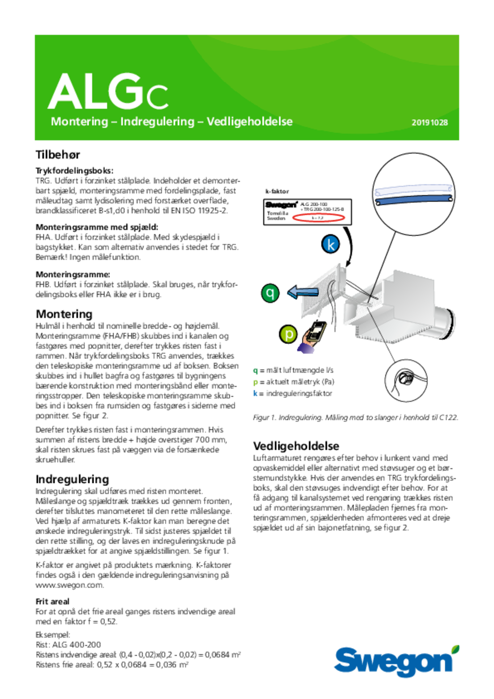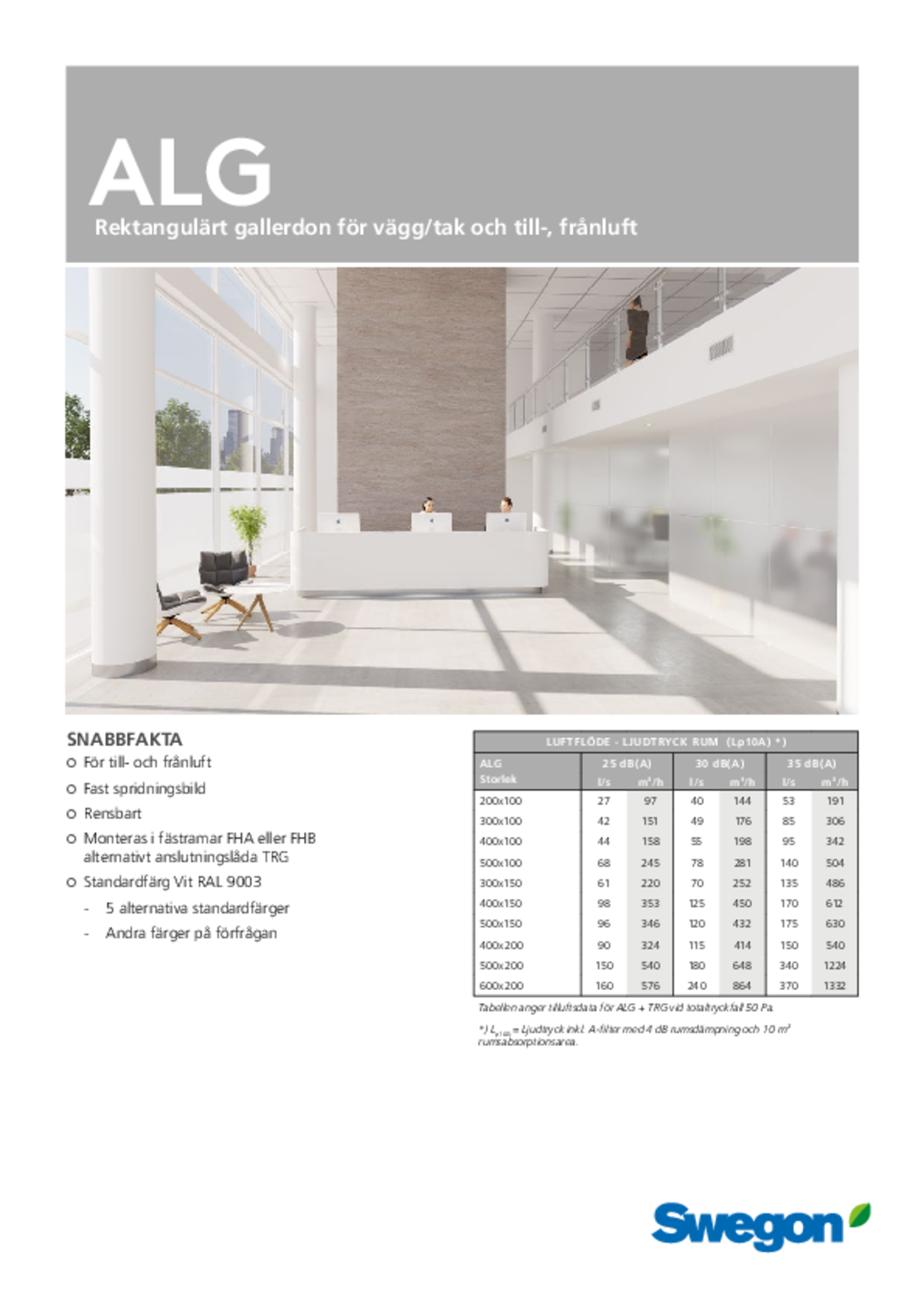 | Tabellen angiver tilluft for ALG + TRG ved totaltrykfald 50 Pa. *) Lp10A = Lydtryk inkl. A-filter med 4 dB rumdæmpning og 10 m² rumabsorptionsareal. | ||||||