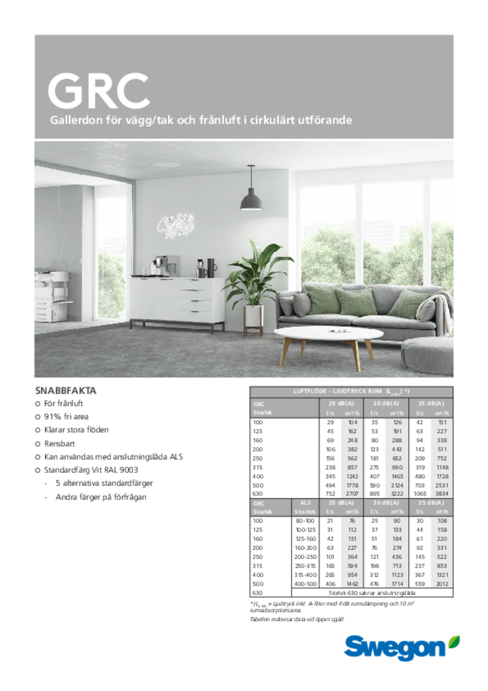 | GRC Størrelse | ALS Størrelse | 25 dB(A) | 30 dB(A) | 35 dB(A) | ||||