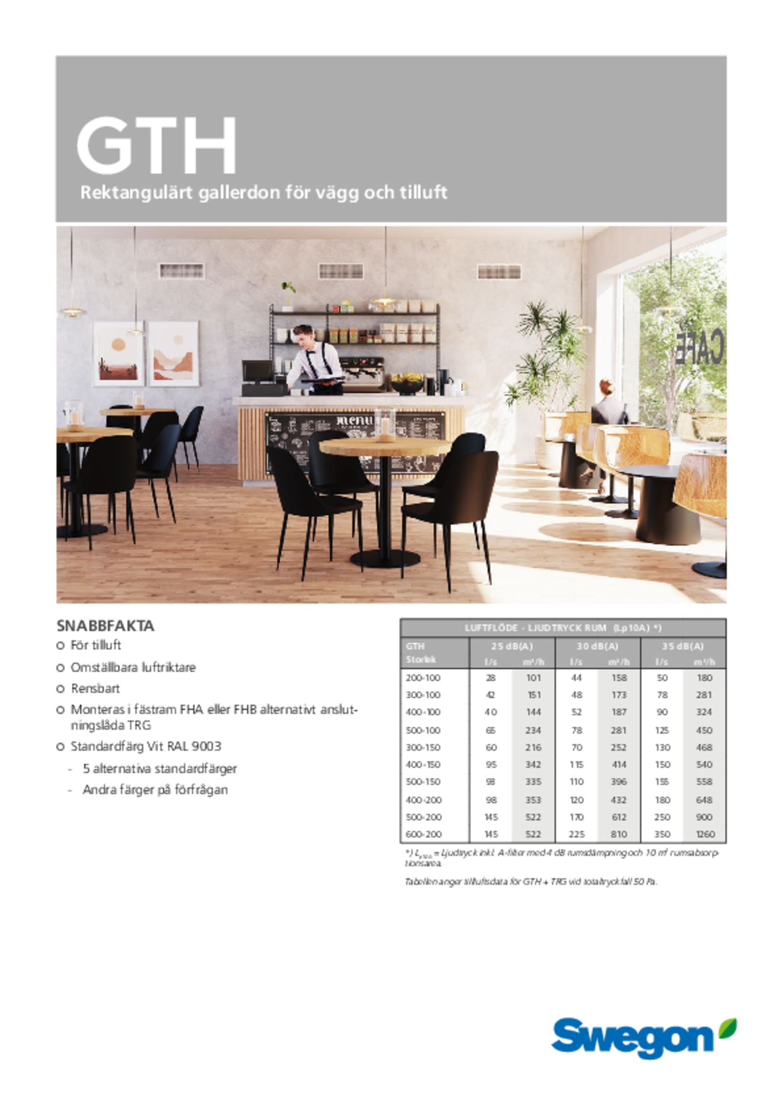 GTH er en rektangulær rist til tilluft. Beregnet til vægmontering. Risten har både vandrette og lodrette luftrettere, som let kan justeres til korrekt kastelængde og spredningsbillede for over- eller undertemperaturkonditionering, luftarmaturets placering, møbler i lokalet og hindringer for luftstrømmen. Ved regulering eller måling af kastelængde skal GTH benyttes med trykfordelingsboks TRG.