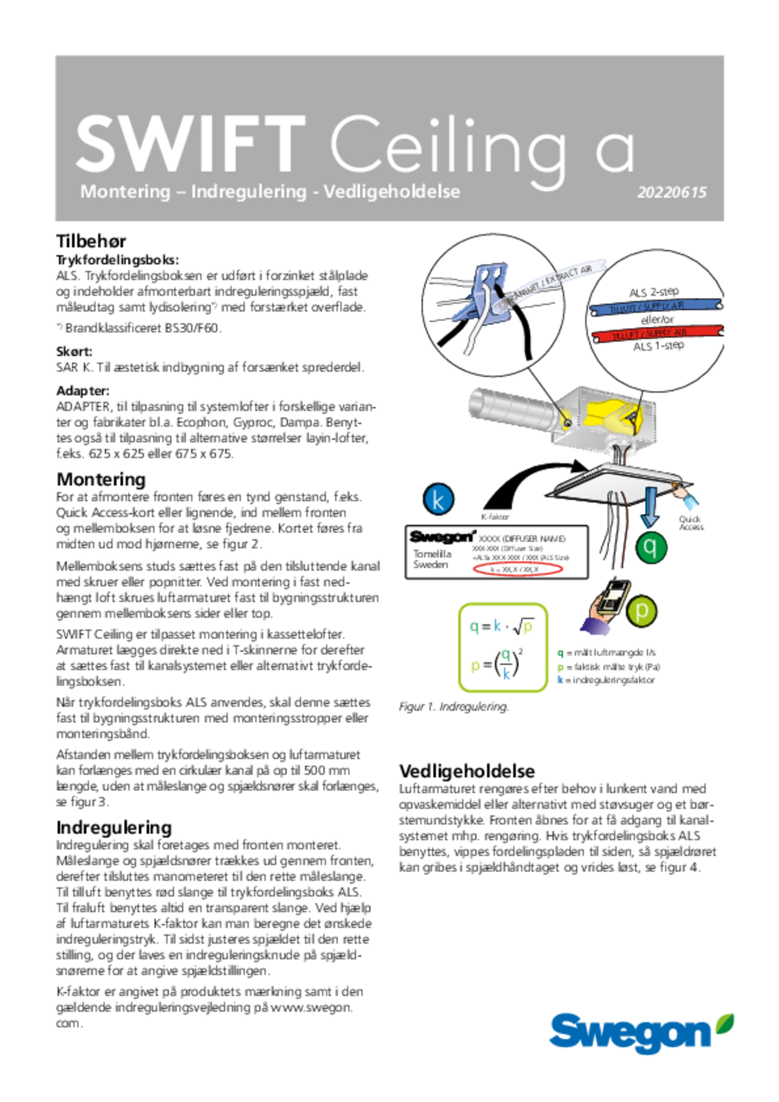 | Montering, indregulering, vedligeholdelse (pdf 849.24kB) | SWIFT Ceiling a | DV-manual | |