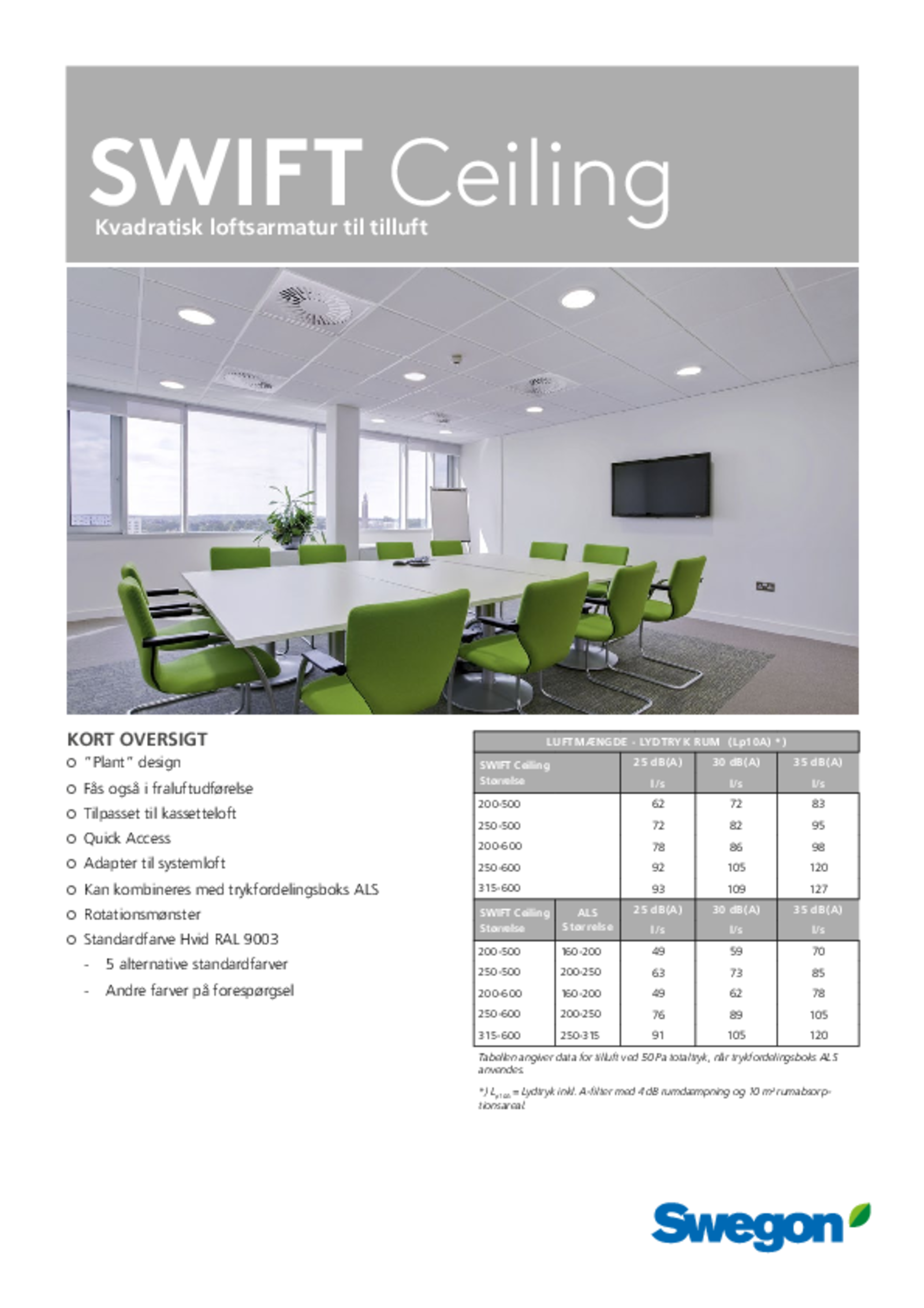 | SWIFT Ceiling Størrelse |  l/s | |||