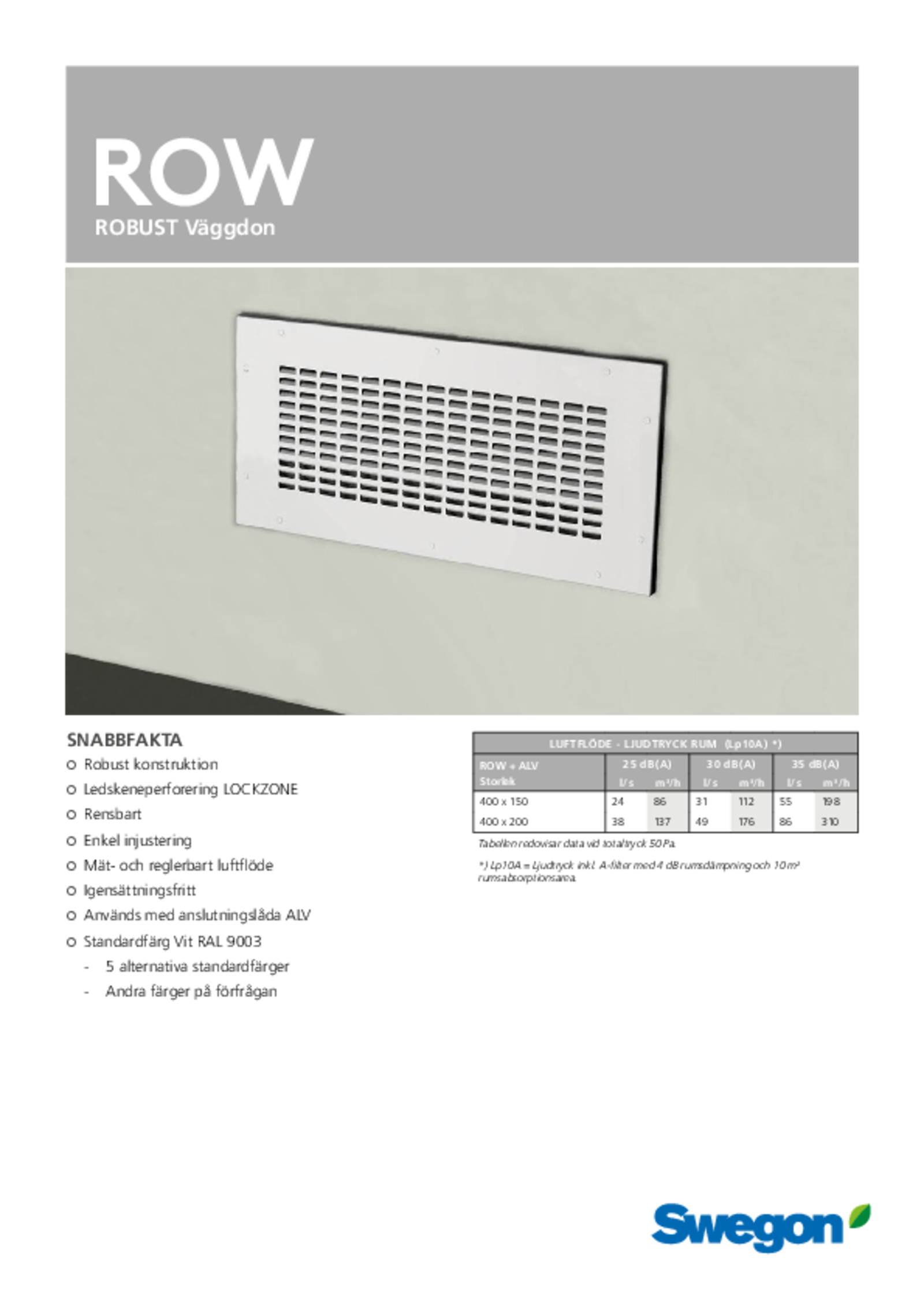 ROW er et forstærket tilluftsarmatur til vægmontering. Luftarmaturet er godkendt til brug i fængsler, ungdomsinstitutioner, plejefaciliteter, skoler osv. Luftarmaturoverfladen har perforering, hvilket giver både kontrolleret spredningsbillede og attraktivt udseende. Velegnet til konstant eller variabel luftmængde. ROW kan også benyttes til lav fortrængning.