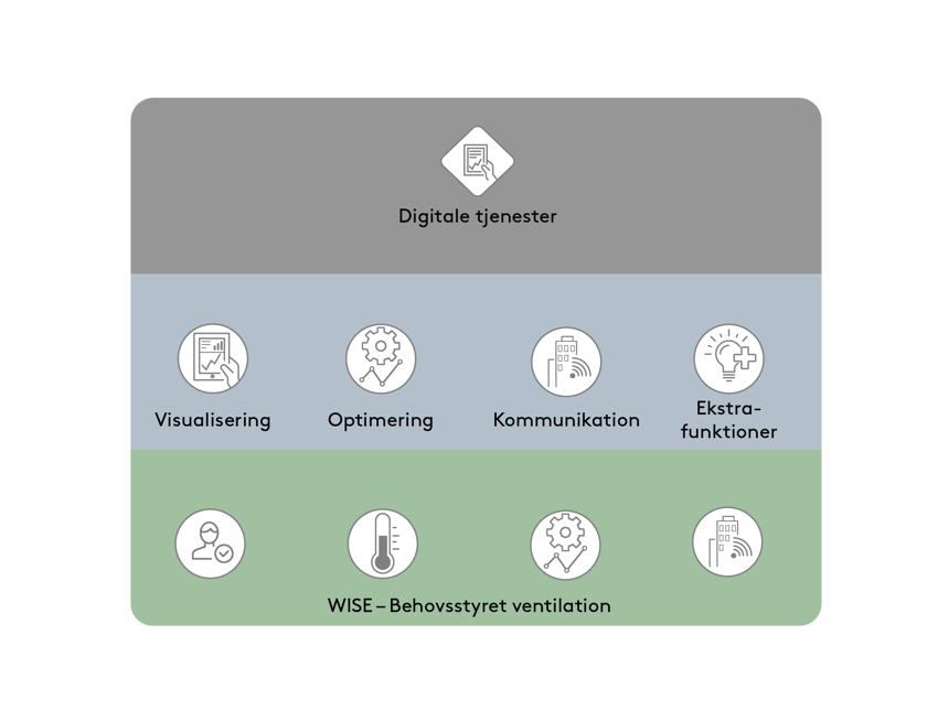 ​WISE indeholder altid en basispakke, som gør det muligt at opnå et behovsstyret indeklima. Ud over grundpakken kan der tilføjes en række løsninger, som f.eks. visualisering, optimering, kommunikation og diverse funktionaliteter. Udover dette kan der også tilføjes en række digitale tjenester:​