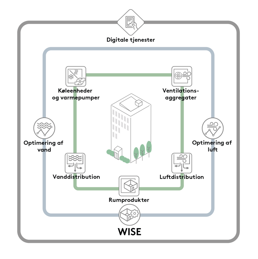 WISE er den smarteste løsning til behovsstyret ventilation (DCV) på markedet og kombinerer optimal komfort med det lavest mulige energiforbrug. WISE er et komplet system med alle de produkter, der kræves til indeklimaet, herunder et smart styresystem og en brugervenlig opsætning. WISE er baseret på en unik teknologi, der skaber et sikkert og fleksibelt system, som forenkler hvert trin i processen – fra systemvalg og planlægning til installation og idriftsættelse. Dette gør det muligt at opfylde de højeste krav i hvert enkelt projekt – uanset om det handler om miljø, netto driftsresultat eller komfort.​