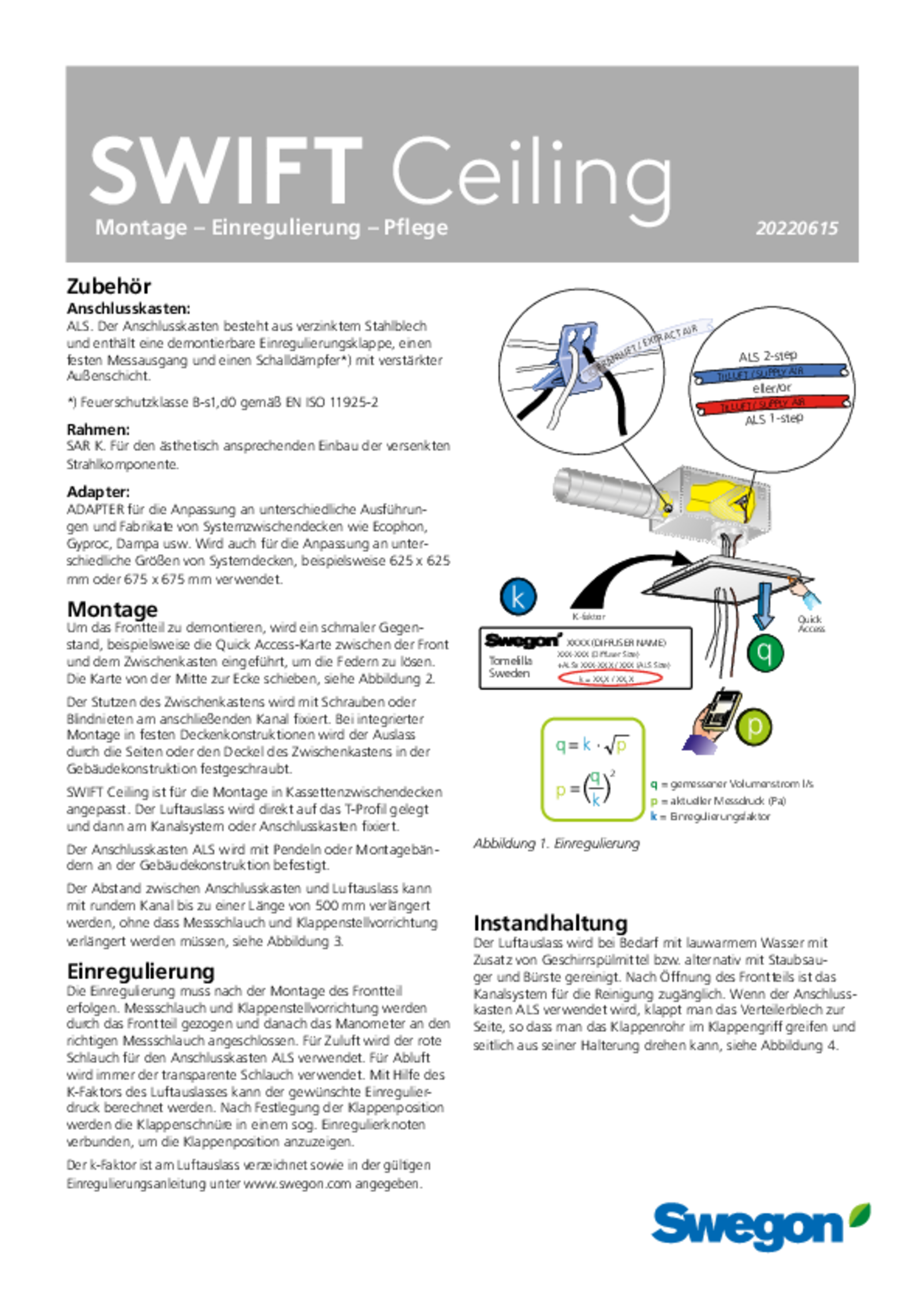 | Montage, Einregulierung, Wartung (pdf 849.01kB) | SWIFT Ceiling a | IOM-Handbuch | |