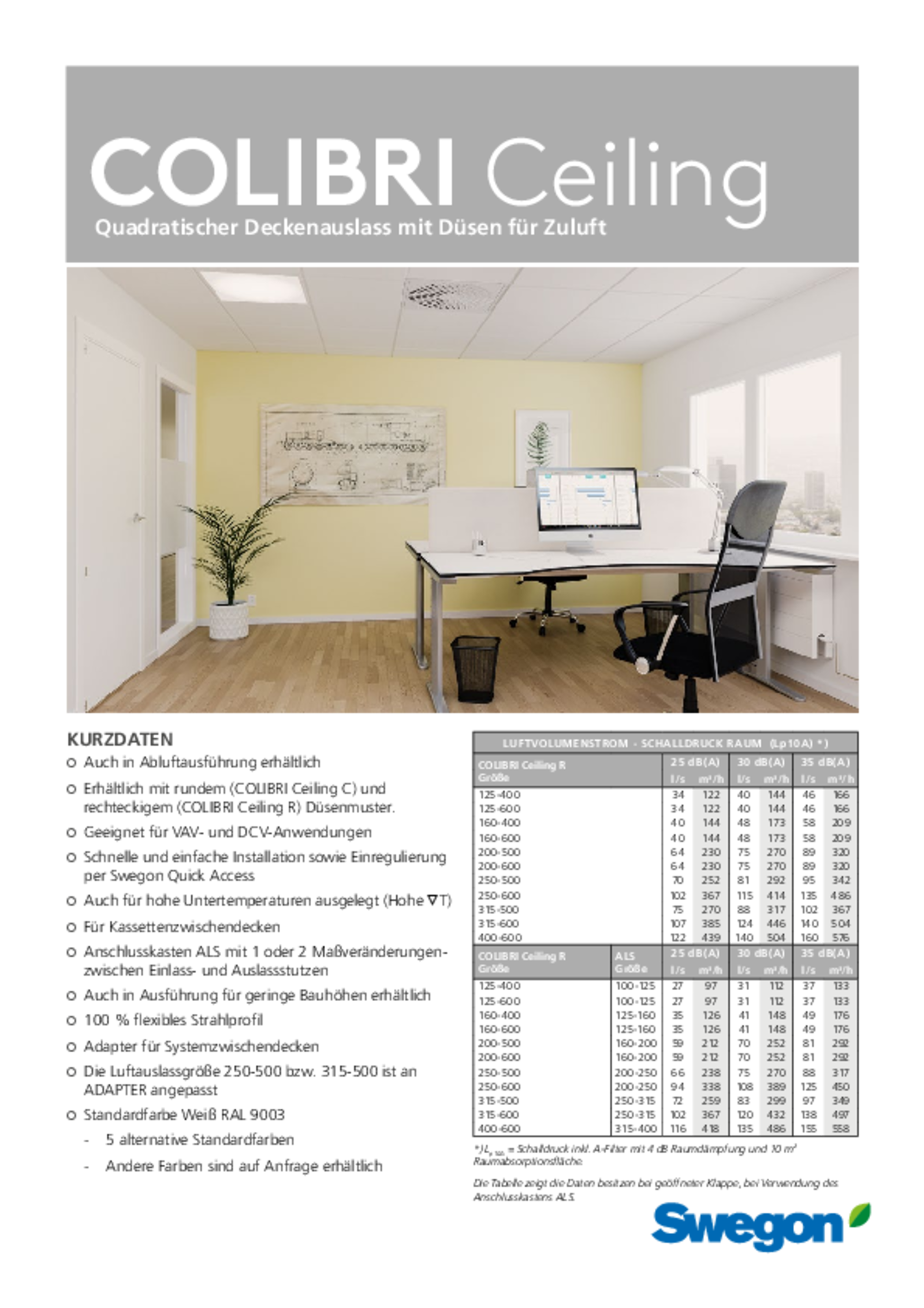 - Auch in Abluftausführung erhältlich- Erhältlich mit rundem (COLIBRI CC) und rechteckigem (COLIBRI CR) Düsenmuster- Geeignet für VAV- und DCV-Anwendungen