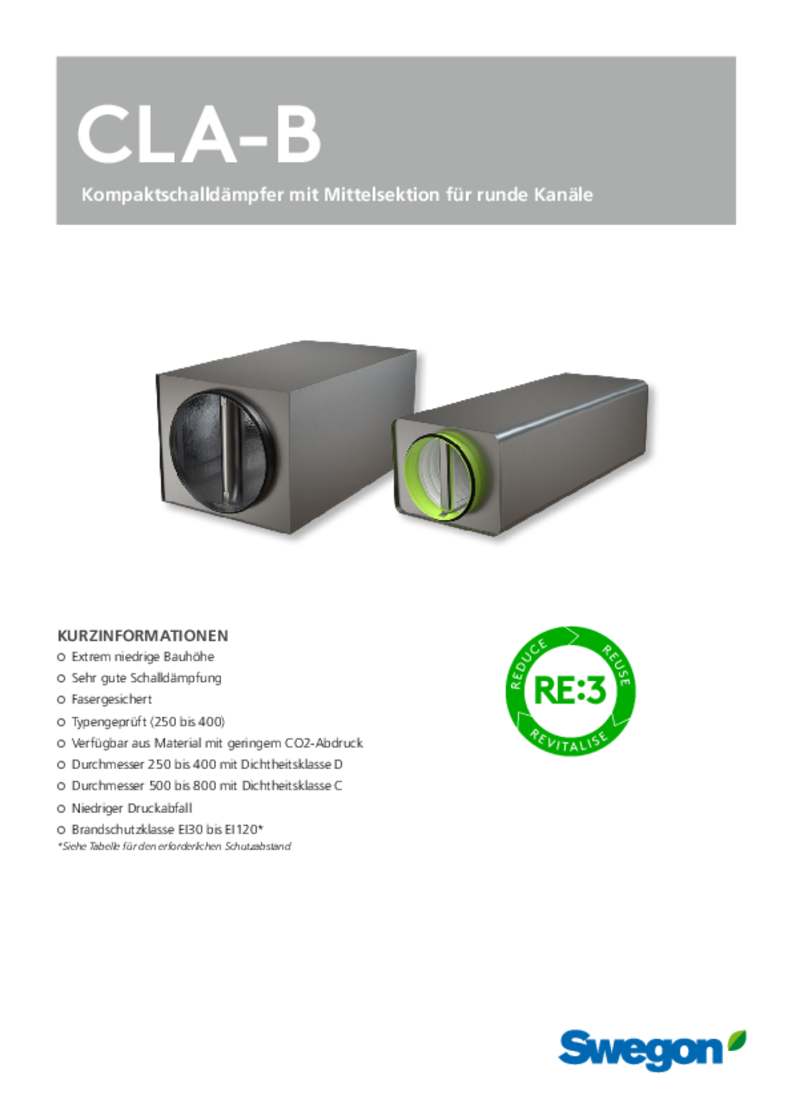 CLA-B ist Teil des RE:3-Konzepts von Swegon, das auf den Schlüsselprinzipien der Zirkularität basiert und aus RE:duce, RE:use und Re:vitalise besteht. CLA-B wird aus nachhaltigem Blech namens RRP hergestellt, wobei RRP für „recycelt und erneuerbar produziert“ steht. Der Stahl hat einen Anteil von mindestens 75 Prozent an recyceltem Stahl. Darüber hinaus kommen bei der Herstellung Elektrolichtbogenöfen zum Einsatz, die zu 100 Prozent mit erneuerbarer Energie betrieben werden.