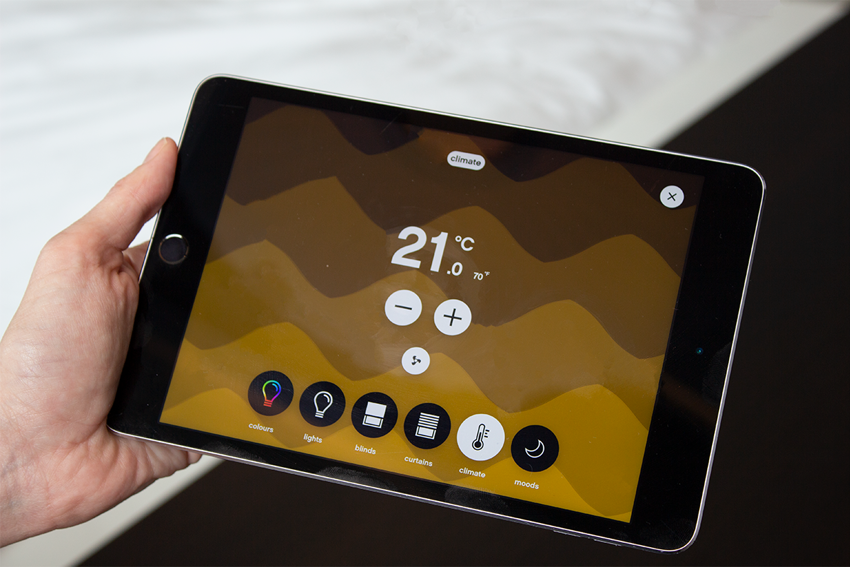 Die Raumtemperatur und die Ventilatorgeschwindigkeit können auf die gewünschten Werte eingestellt werden. Sie müssen nicht aus dem Bett aufstehen, um die Jalousien zu öffnen, sondern drücken einfach einen Knopf auf dem Moodpad. Bevorzugen Sie kühles oder warmes Licht? Stellen Sie ein, wie Sie wollen! Sie können sogar die Farbe des Lichts wählen! Wenn Sie Lust auf grünes Badezimmerlicht haben, ist das nur einen Klick entfernt.
