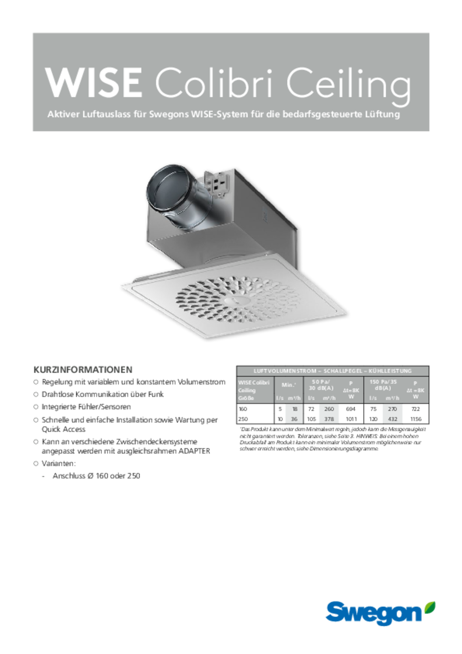 Aktiver Luftauslass für Swegons WISE-System für die bedarfsgesteuerte Lüftung (pdf 762.27kB) WISE Colibri Ceiling a Technischer Katalog