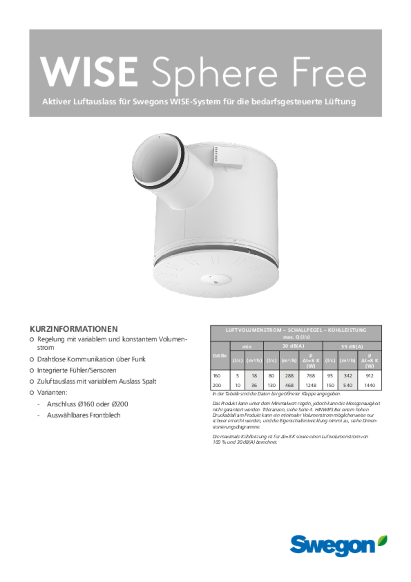 Aktiver Luftauslass für Swegons WISE-System für die bedarfsgesteuerte Lüftung (pdf 1.27MB) WISE Sphere Free c Technischer Katalog