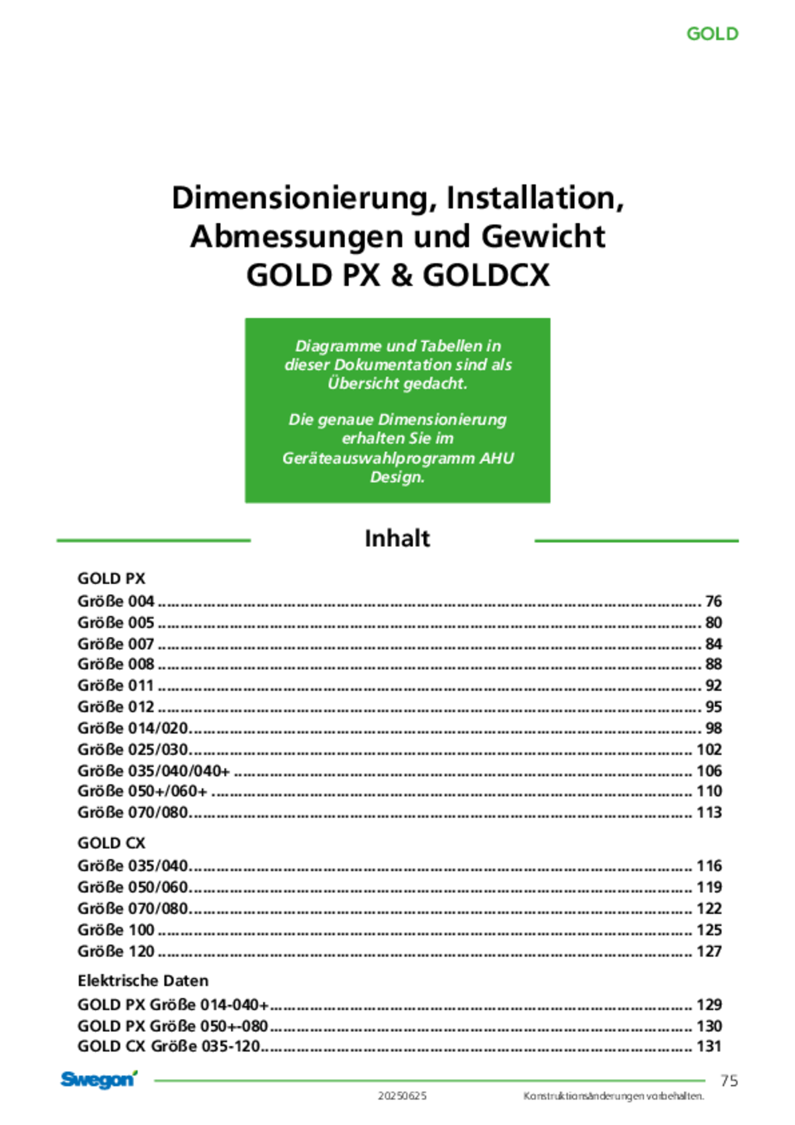 Abmessungen, Installation, Maße und Gewichte (pdf 6.84MB) GOLD PX/CX Technischer Katalog