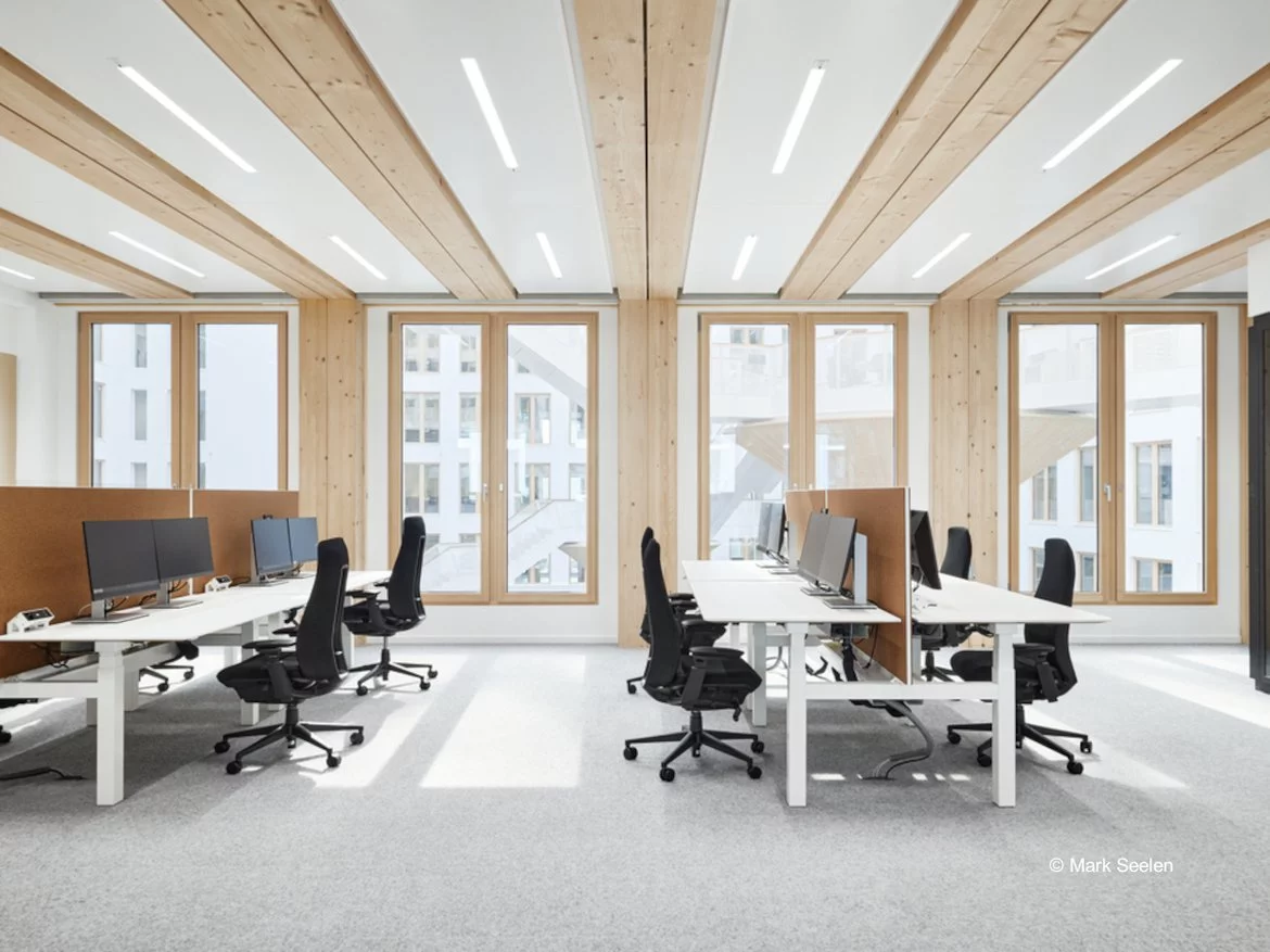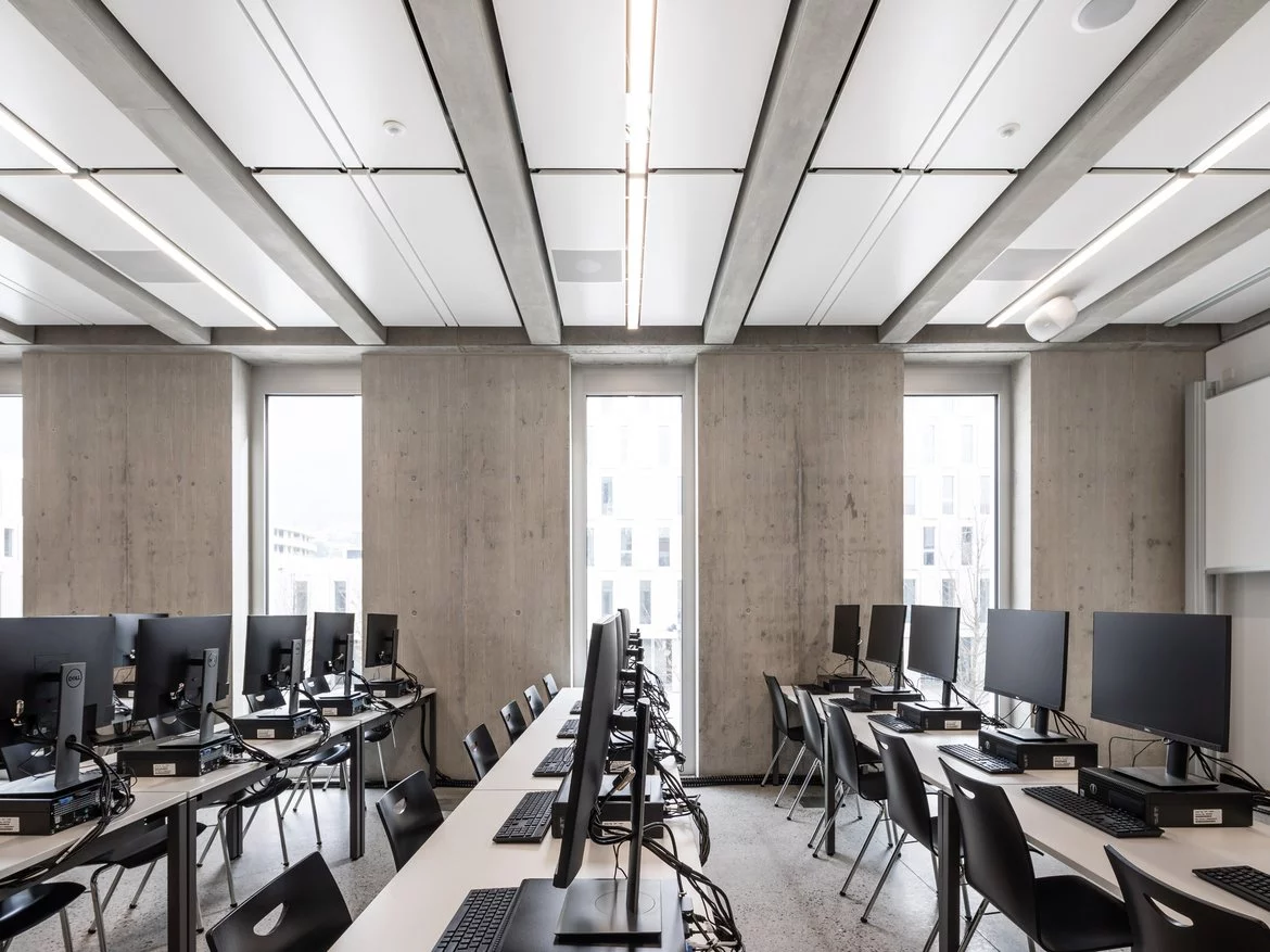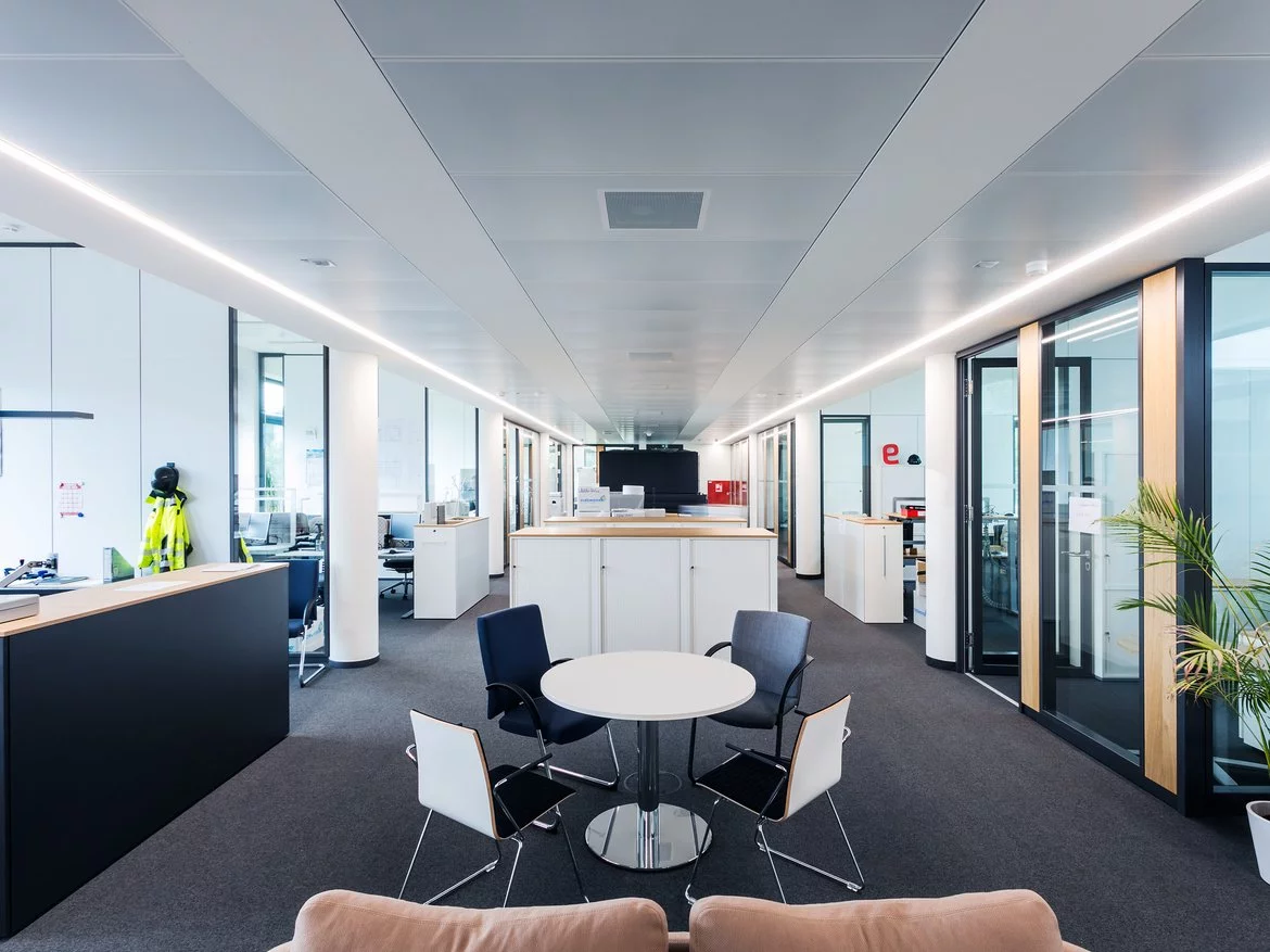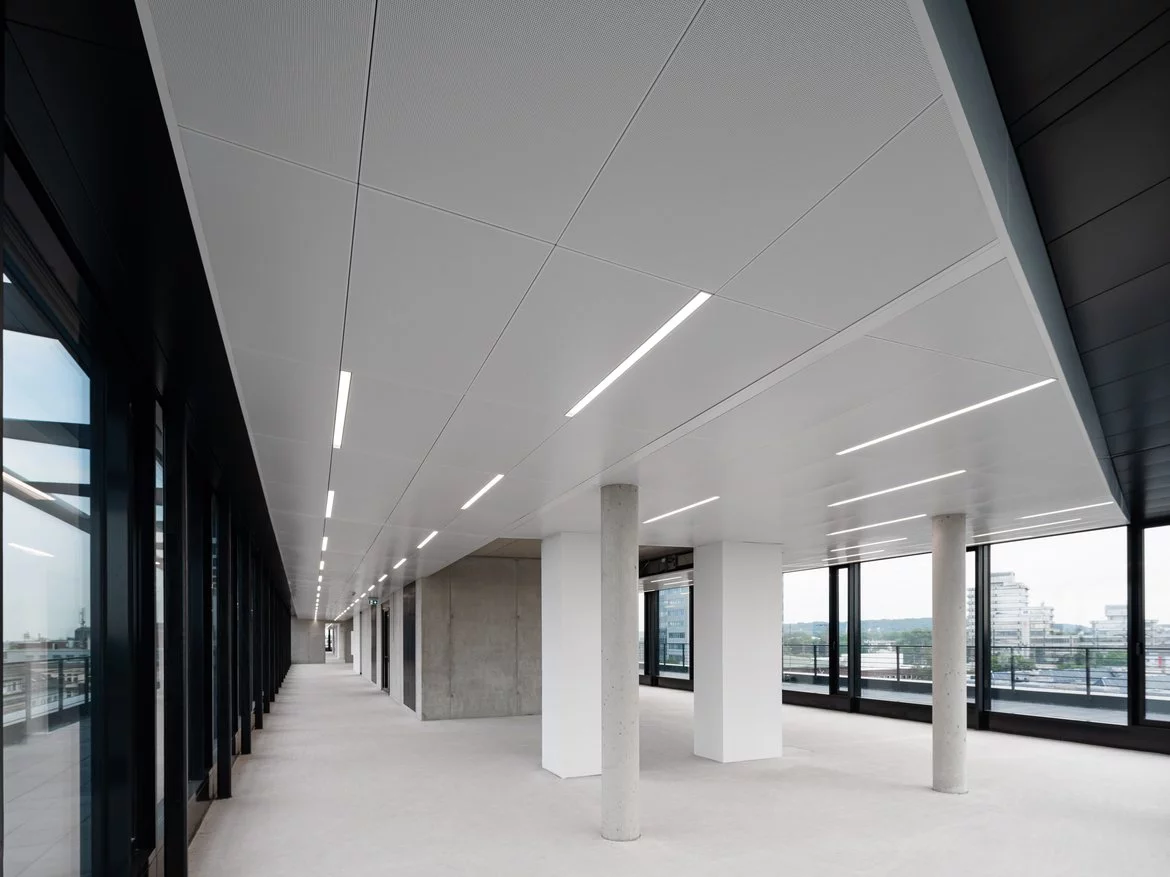 Die eingebauten U4X Heiz- / Kühldeckenmodule + AQUILO Zuluftelement setzen einen neuen Standard. Sie sorgen für höchste Raumbehaglichkeit und dadurch für eine höhere Effizienz der Mitarbeitenden.