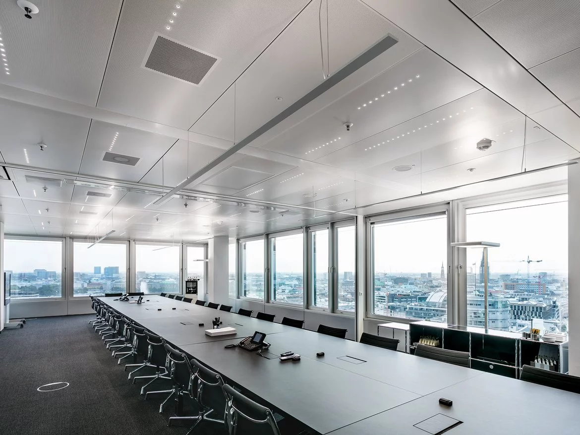 Im Mercator One kamen folgende Klimadeckensysteme zum Einsatz: das U4X Heiz- / Kühldeckenmodul und die A11-C Heiz- / Kühldecke Metall mit dem Zuluftelement AQUILO, beide mit integrierter Lichtlösung.