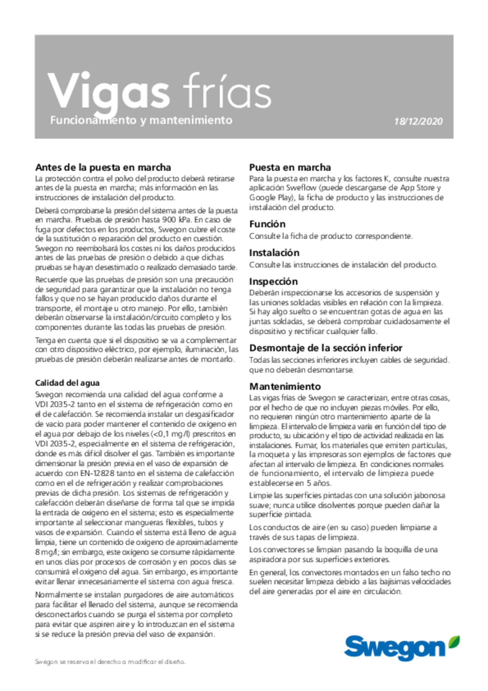 - Viga frÃa para la climatización interior en función de la demanda, integrada en la plataforma de control WISE de Swegon