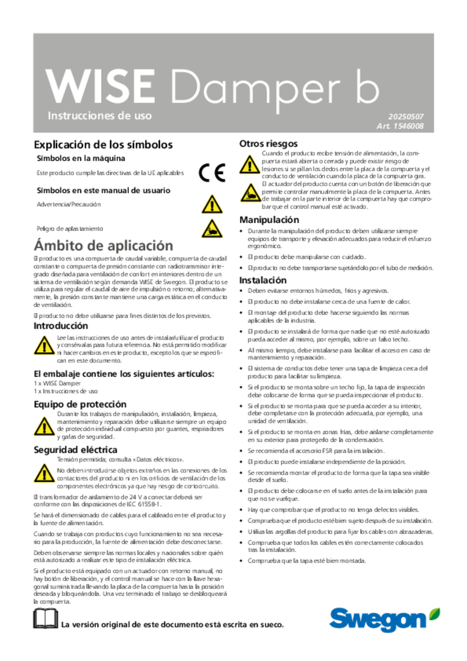 | Active damper for Swegon’s WISE System for demand controlled ventilation (pdf 1.89MB) | WISE Damper b | Catálogo ténico | |