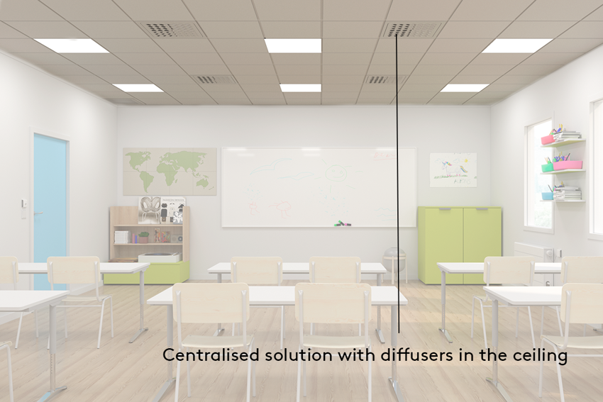 Una solución descentralizada como una unidad de tratamiento de aire COMPACT puede encajar sutilmente en la esquina del aula (imagen inferior izquierda). O, por el contrario, un sistema centralizado con difusores se integra sin problemas en el techo (imagen inferior derecha).