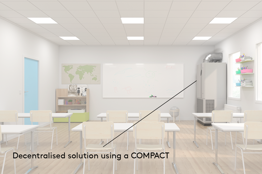 Por ejemplo, una unidad COMPACT Air o Class Unit PX, puede colocarse directamente en el aula contra una pared o en el techo, lo que significa que no se necesitan conductos, proporcionando una instalación inmejorablemente rápida. Esto proporcionará aire fresco a la sala y extraerá el aire contaminado, pero gracias al intercambiador de calor incorporado, la energía del aire interior no se desperdiciará.