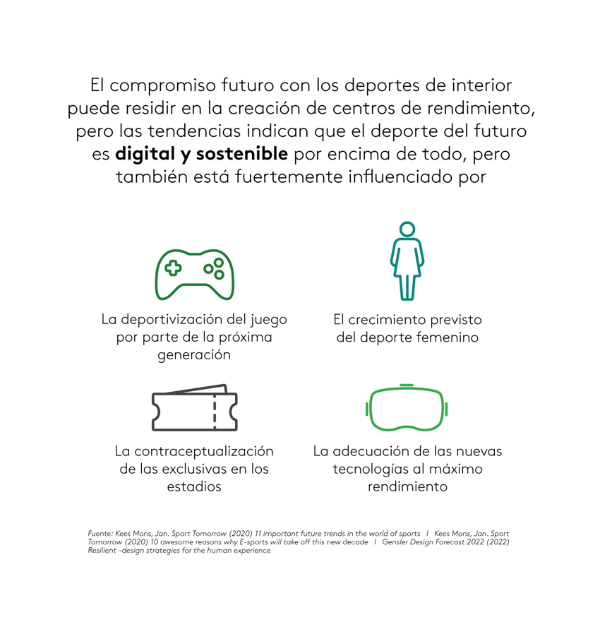 Fuentes: Abraham, Jonalyn. Gensler (2021) Designing performance centers to promote well-being for athletes I Internicola, Dorene. Reuters (2013) Outdoor exercisers can reap unexpected benefits by moving indoors