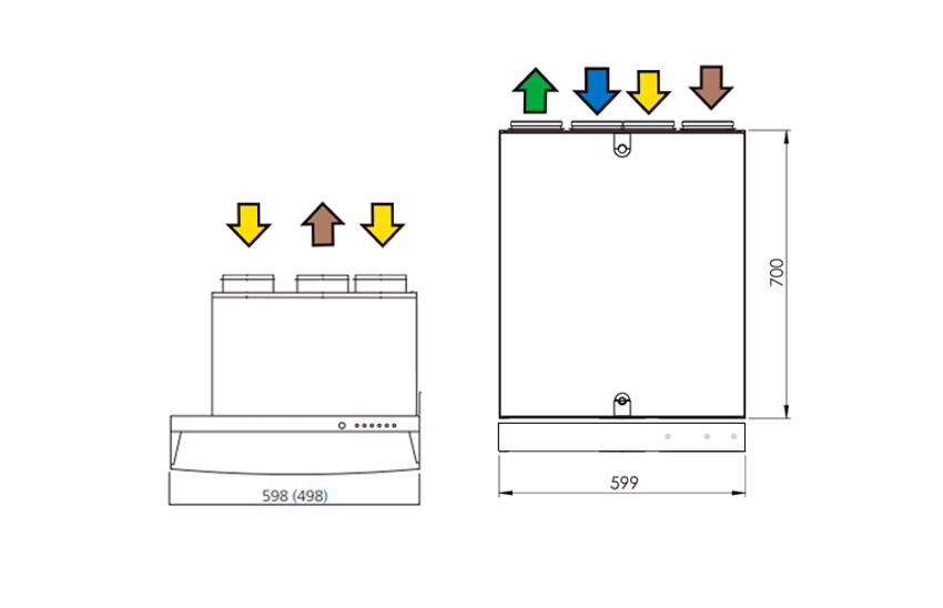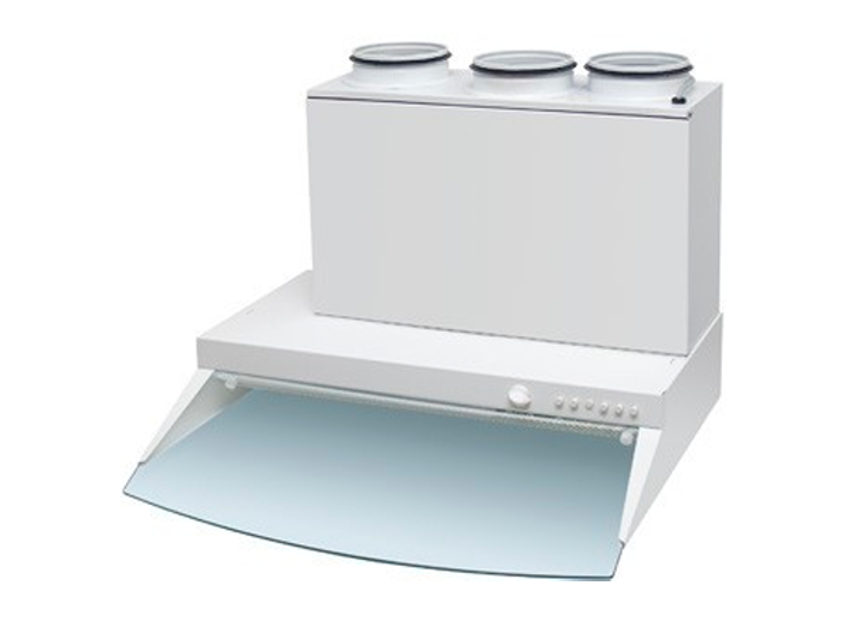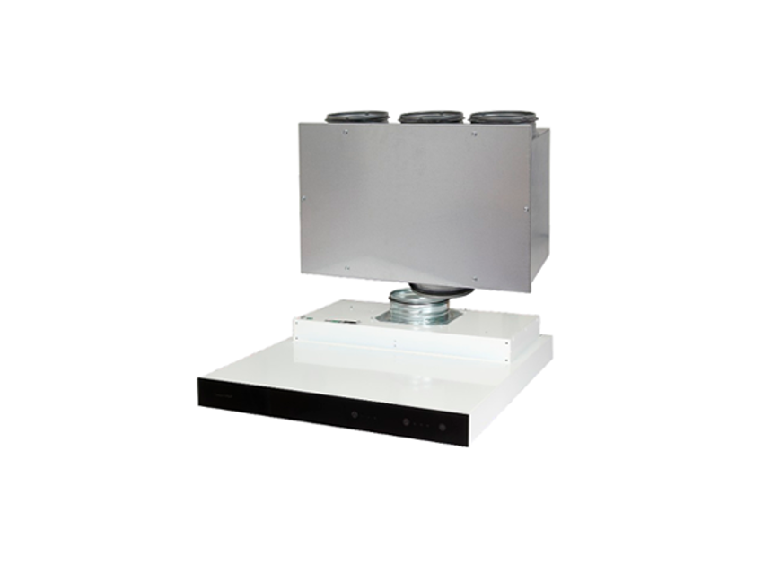 Kuvassa ILMO-talotuuletin sekä CASA R3 -ilmanvaihtokoneen oikeakätinen laite (R-malli) yhdistettynä Jazz-liesikupuun. Vasenkätisesssä R3-koneessa (L-malli) kanayhteiden järjestys on peilikuvana.