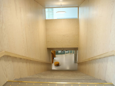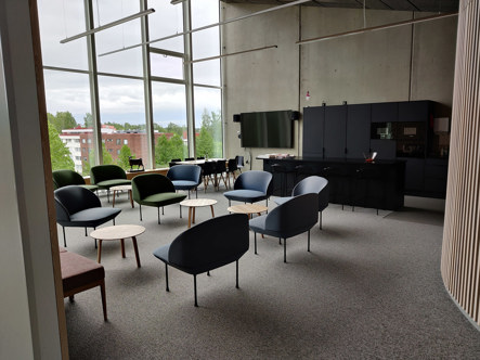 Näyttävät puupinnat ovat osa Lumitin yleisilmettä ja puun käyttö toimii myös akustiikan tukena.