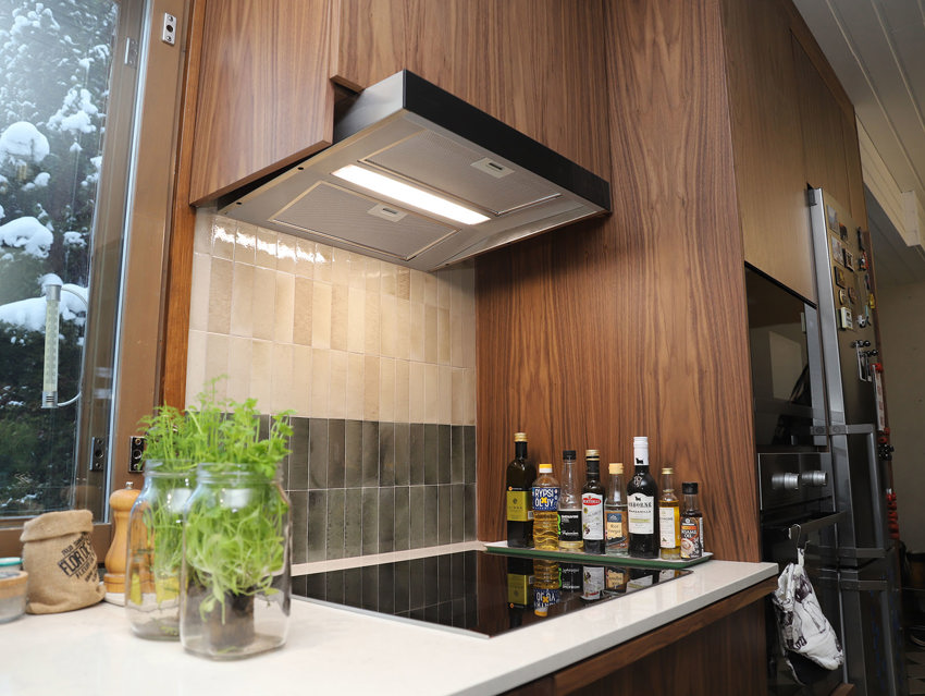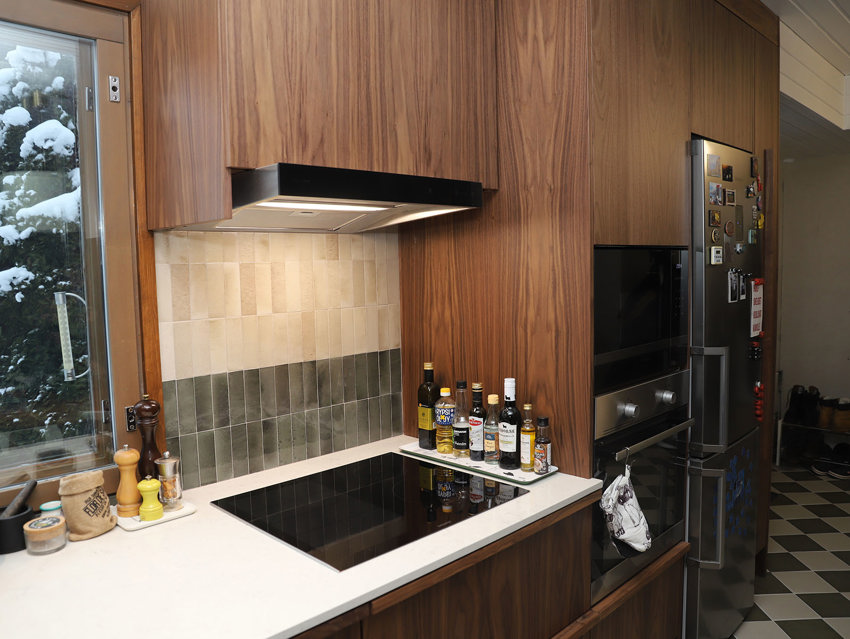 - Kaikki kanavat piti saada mahtumaan keittiön kaapin yläsokkeliin. Tilat olivat ahtaat. Liesikupu olisi yleensä tullut suoraan iv-koneen alapuolelle, mutta nyt väliin tuli hyllytaso. Tarvitsimme sopivan mittaisen jatkopalan, joka istuikin hyvin ja imuteho oli riittävä, Salo kertoo.
