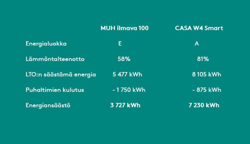 Esimerkiksi 70 l/s vertailuilmamäärällä tehty laskelma osoittaa, että ilmanvaihdon hukkaamaa energia Etelä-Suomessa ilman lämmöntalteenottoa on 10 953 kWh vuodessa. Vanha MUH ilmava saa tästä talteen noin puolet. Uusi Swegon CASA W4 Smart puolestaan kerää talteen jopa 81%.