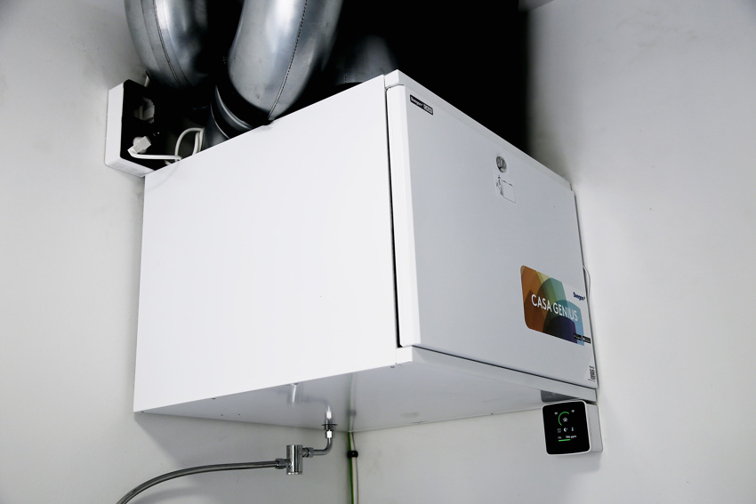 Asunnon ilmanvaihtokoneeksi valittiin Swegonin uusi CASA W4 xs Genius -älyilmanvaihtolaite. Vertti kertoo, ettei hän ennen rakentamista käsittänyt miten älykkäitä nykyaikaiset ilmanvaihtokoneet voivat olla. Laite tarkkailee sisäilmaa ja säätää ilmanvaihtoa automaattisesti kosteus- ja hiilidioksidipitoisuuden mukaan.