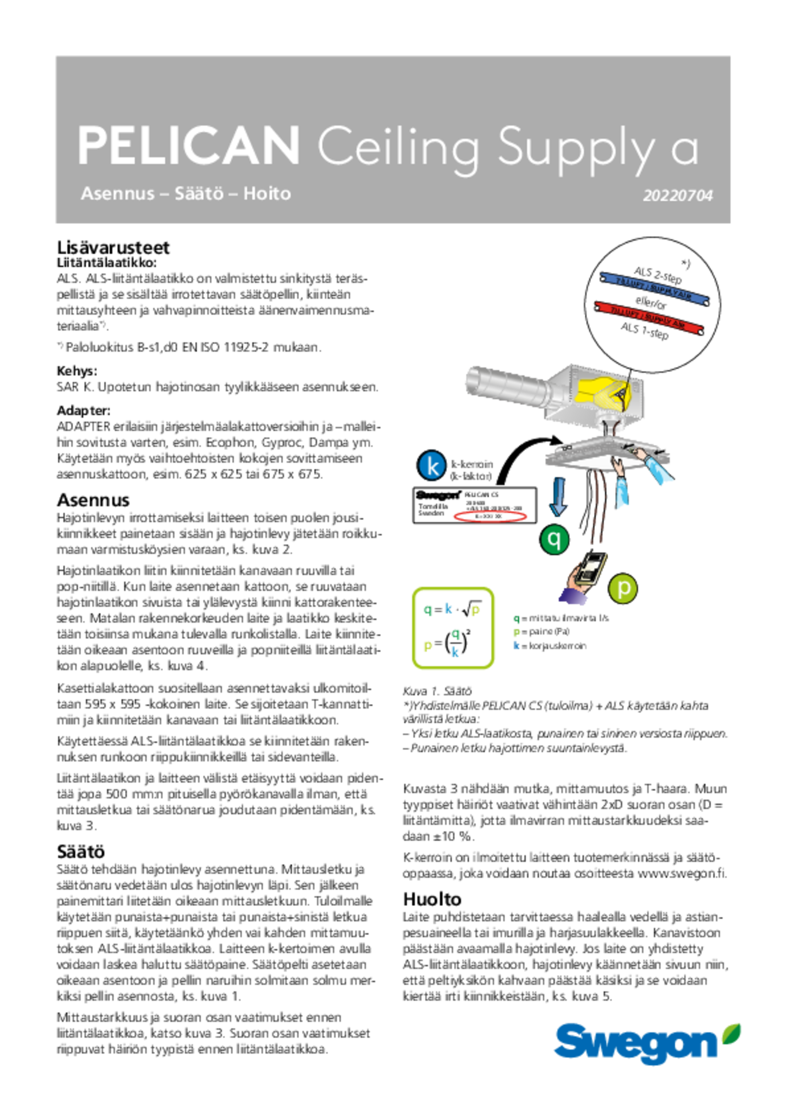 | Asennus, säätö, huolto (pdf 2.44MB) | PELICAN Ceiling Supply a | Asennus- ja huoltomanuaali | |