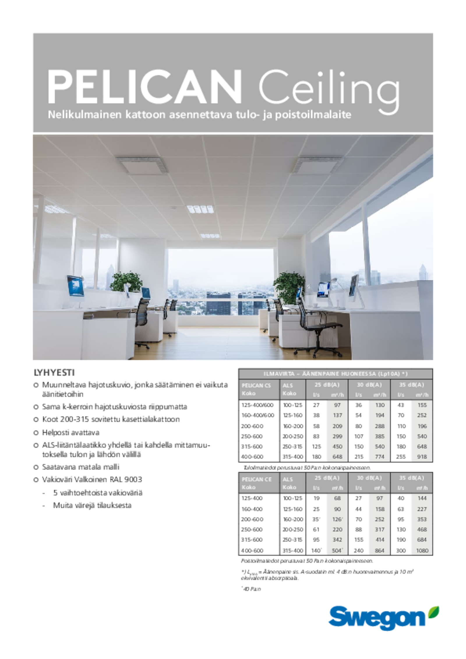 | Nelikulmainen kattoon asennettava tulo- ja poistoilmalaite (pdf 2.6MB) | PELICAN Ceiling Supply a, PELICAN Ceiling Extract a | Tekninen luettelo | |