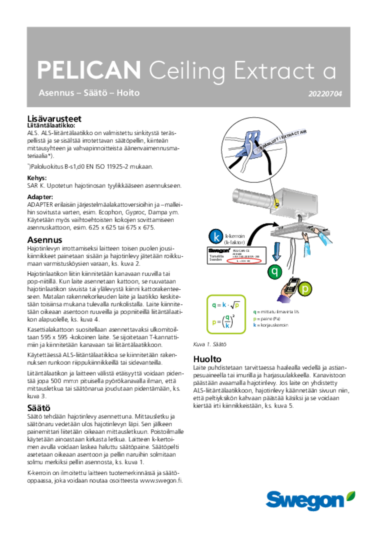| Asennus, säätö, huolto (pdf 1.88MB) | PELICAN Ceiling Extract a | Asennus- ja huoltomanuaali |