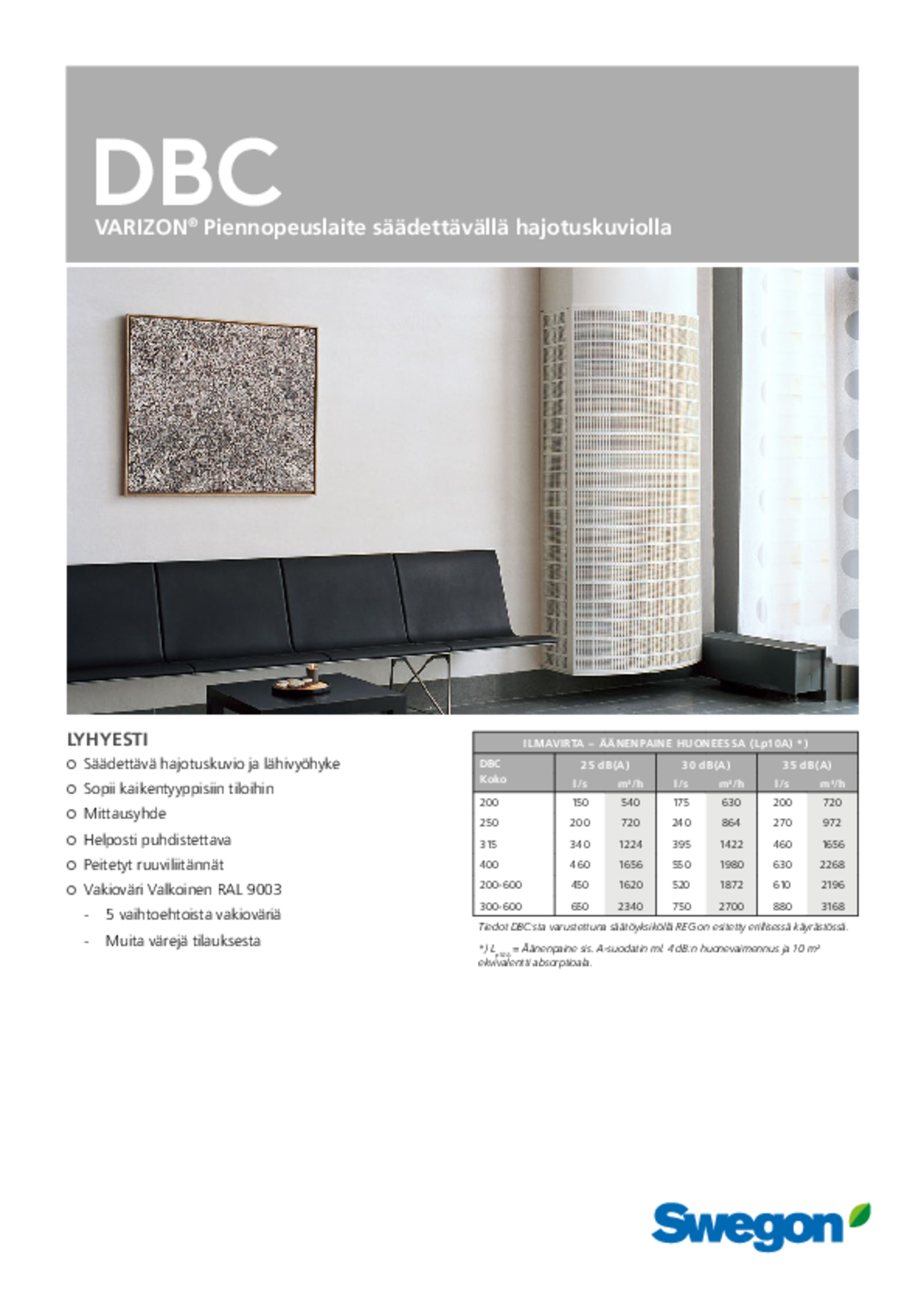 DBC on täydellinen suorakaiteen muotoinen kaareva syrjäyttävä ilmanjakolaite. Se puhaltaa ilmaa oleskeluvyöhykkeeseen alhaisella nopeudella. Hajotuskuvio on helppo säätää säädettävien suuttimien ansiosta. Lisävarusteina saatavana lattiasokkeli, kanavaverhous ja säätöyksikkö.