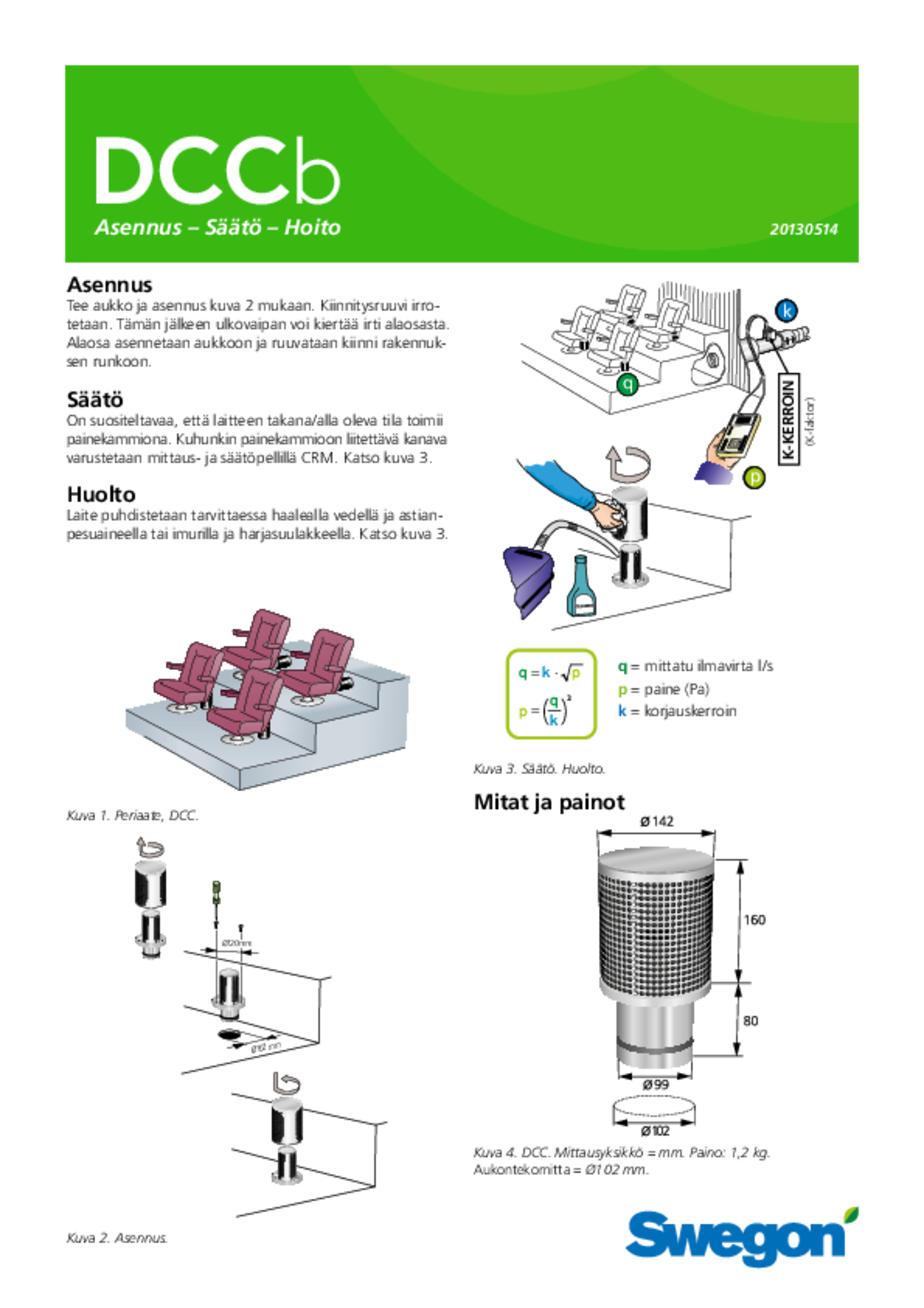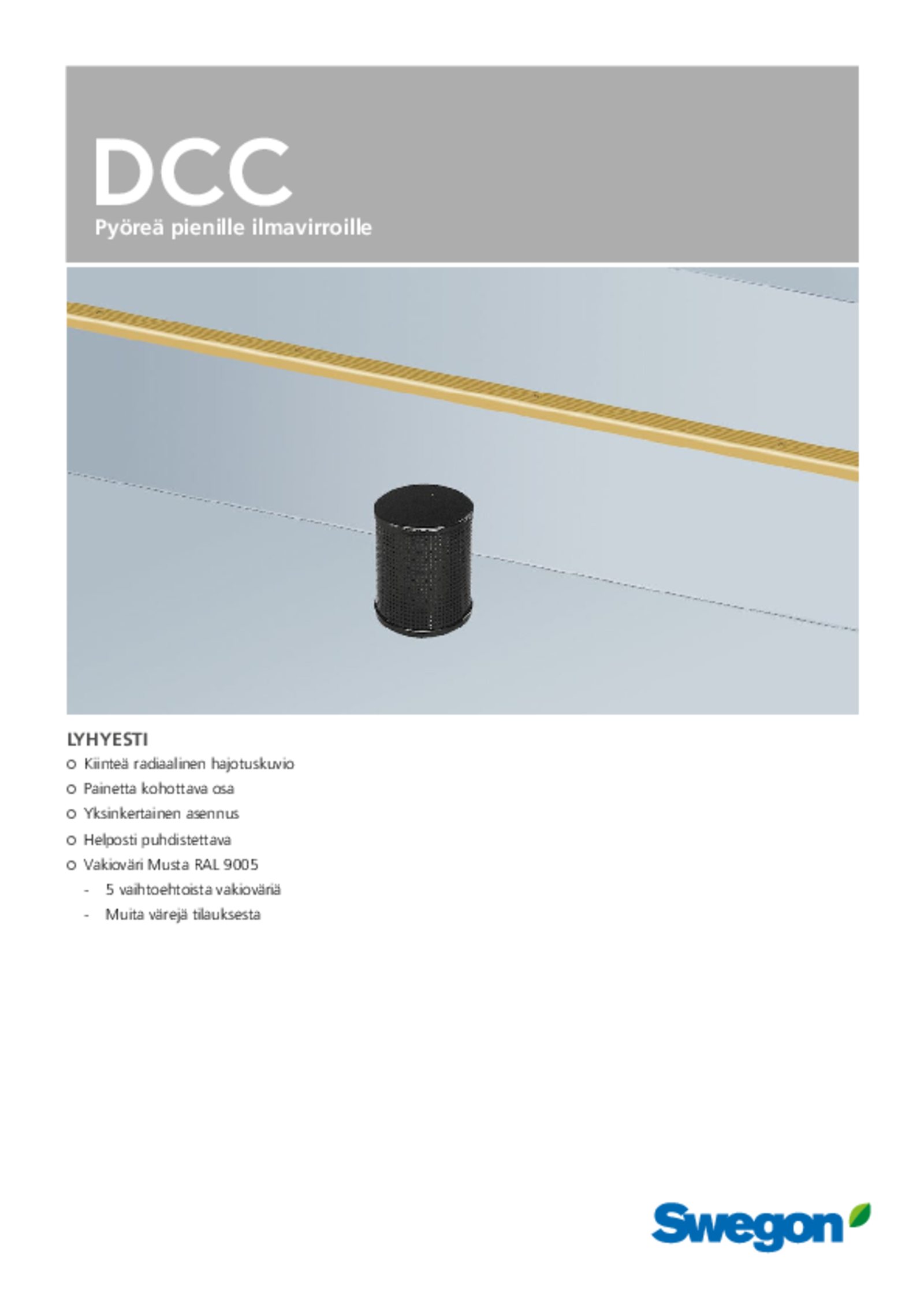 DCC on pyöreä piennopeuslaite pienille ilmavirroille. Se sopii hyvin tiloihin, joissa useita pieniä laitteita voidaan sijoittaa parasta mahdollista ilmanjakoa varten, esim. salit, teatterit, elokuvateatterit ja luentosalit. Asenna ilmanjakolaitteet istuinten alle, portaiden pystypinnoille tai vaakaosille.