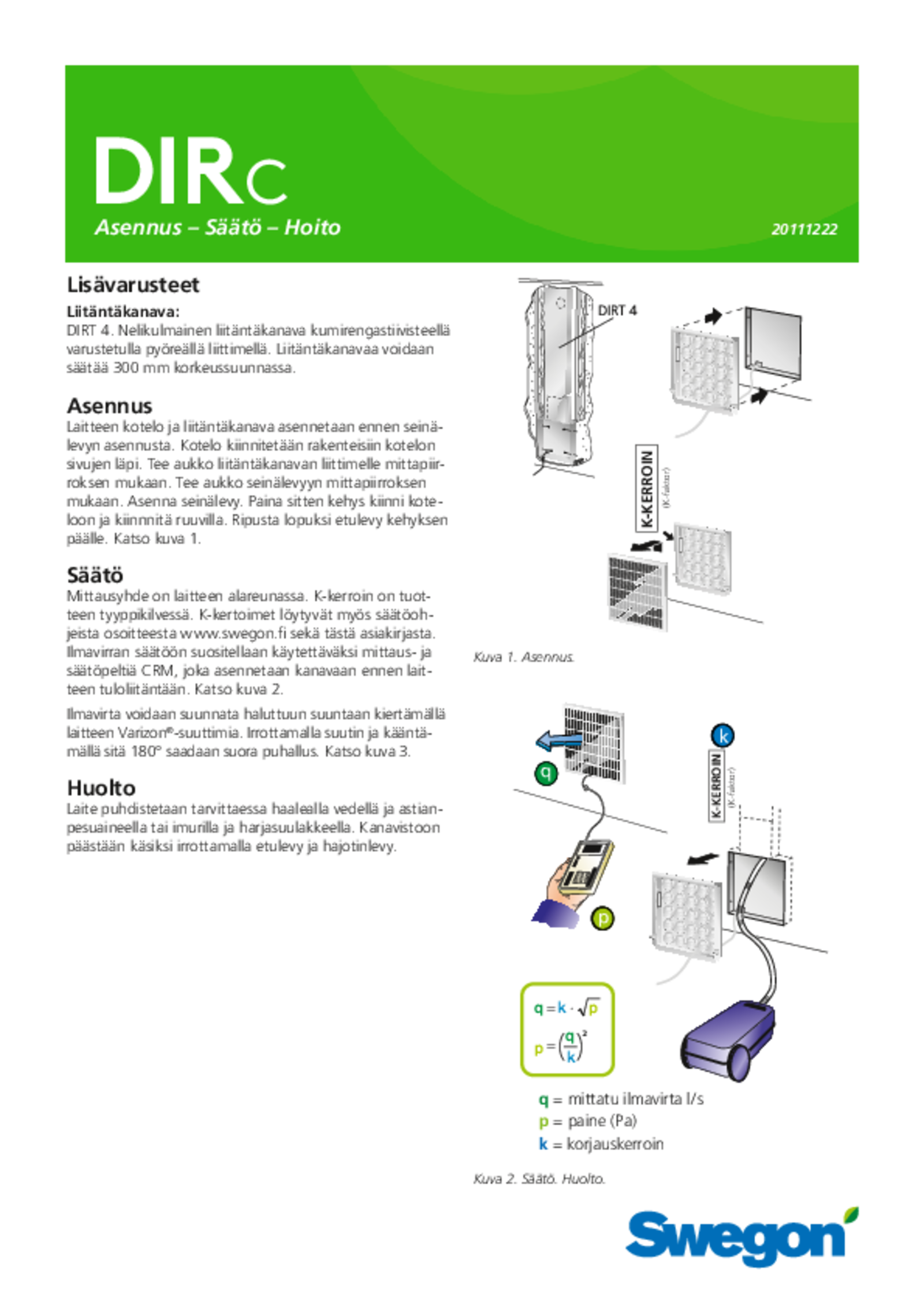 | Asennus, säätö, huolto (pdf 1.15MB) | DIRc | Asennus- ja huoltomanuaali | |