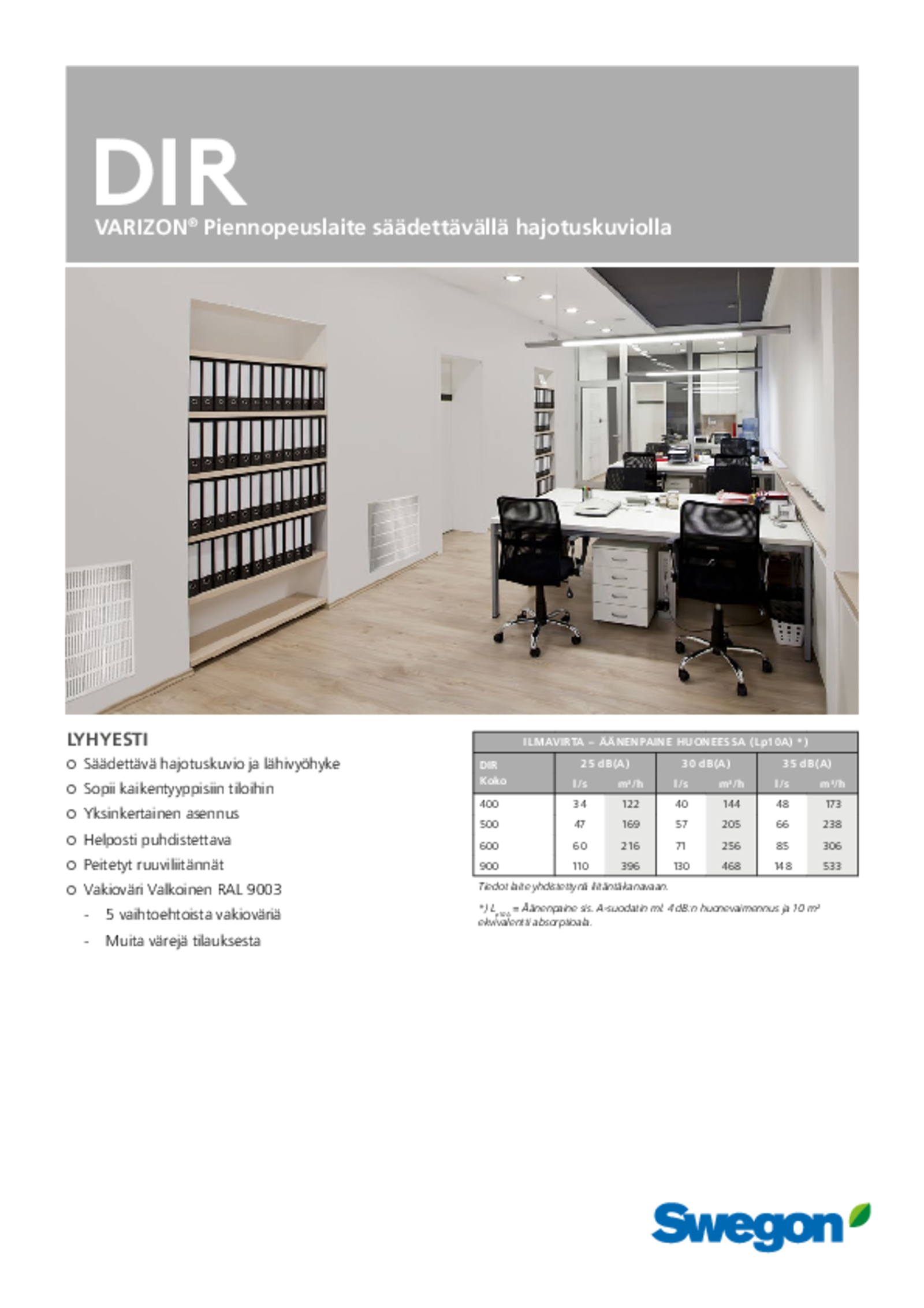 DIR on seinälle asennettava syrjäyttävä ilmanjakolaite. Se puhaltaa ilmaa oleskeluvyöhykkeelle pienellä nopeudella. Hajotuskuvio on helppo säätää säädettävien suuttimien ansiosta. Liitäntäkanava on saatavana lisävarusteena.