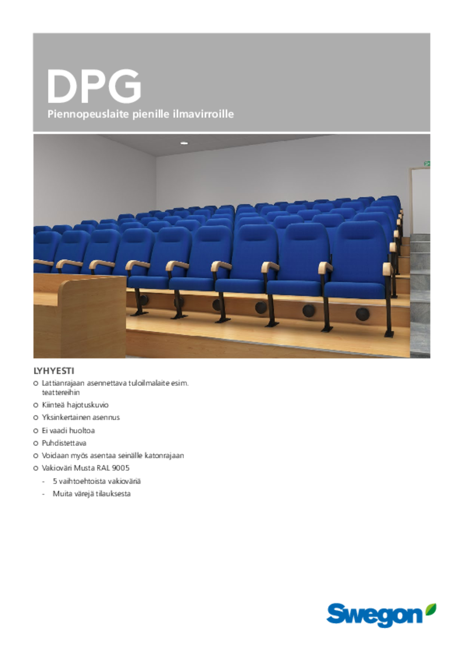 DPG on pyöreä piennopeuslaite pienille ilmavirroille. Ilma puhalletaan huoneeseen pienellä nopeudella. Se sopii hyvin tiloihin, joissa useita pieniä laitteita voidaan sijoittaa eri paikkoihin parasta mahdollista ilmanjakoa varten, esim. salit, teatterit, elokuvateatterit ja luentosalit. Ilmanjakolaitteet asennetaan istuinten alle portaiden pystypintaan. Lattian alapuolinen tila toimii painekammiona. Ilmanjakolaitteita voidaan käyttää tavallisina seinälaitteina.