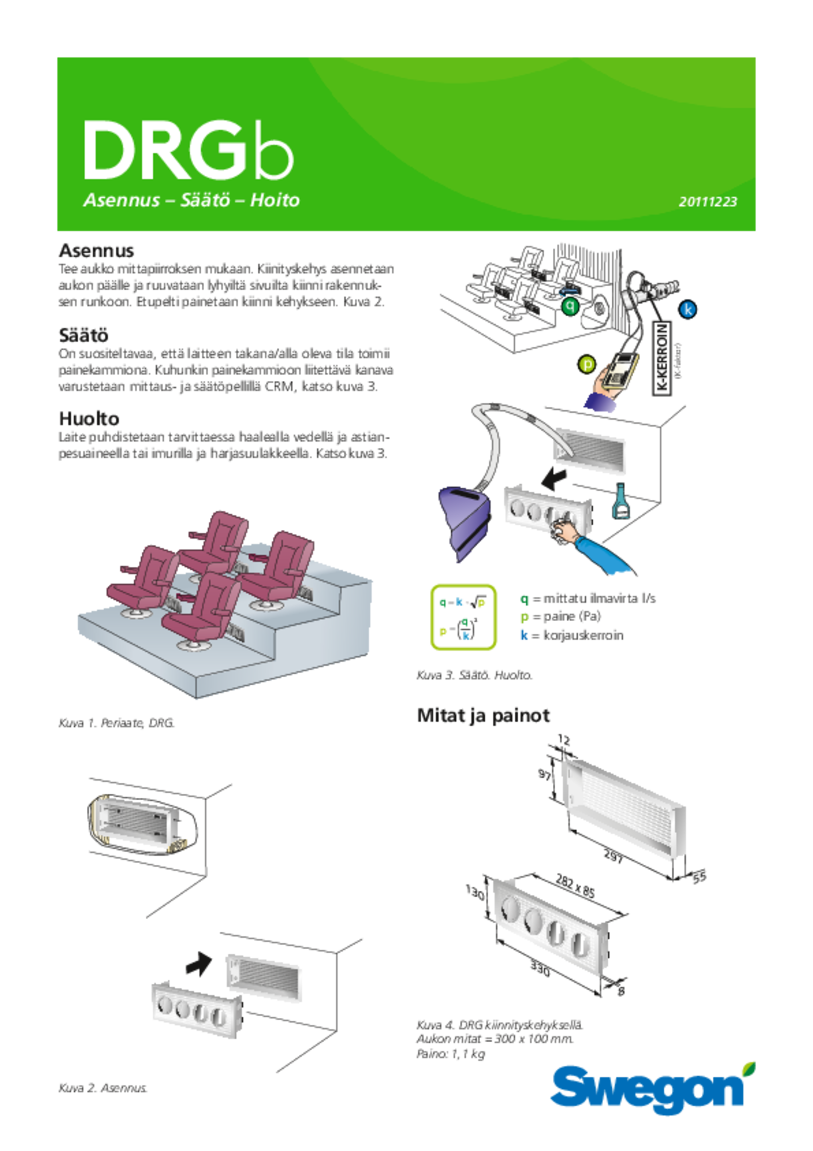 DRG on nelikulmainen piennopeuslaite pienille ilmavirroille, joka puhaltaa ilmaa tilaan pienellä nopeudella. Hajotuskuvio on helppo säätää säädettävien VARIZON®-suuttimien ansiosta. Se sopii hyvin tiloihin, joissa useita pieniä laitteita voidaan sijoittaa eri paikkoihin parasta mahdollista ilmanjakoa varten, esim. salit, teatterit, elokuvateatterit ja luentosalit. Ilmanjakolaitteet asennetaan istuinten alle portaiden pystypintaan.