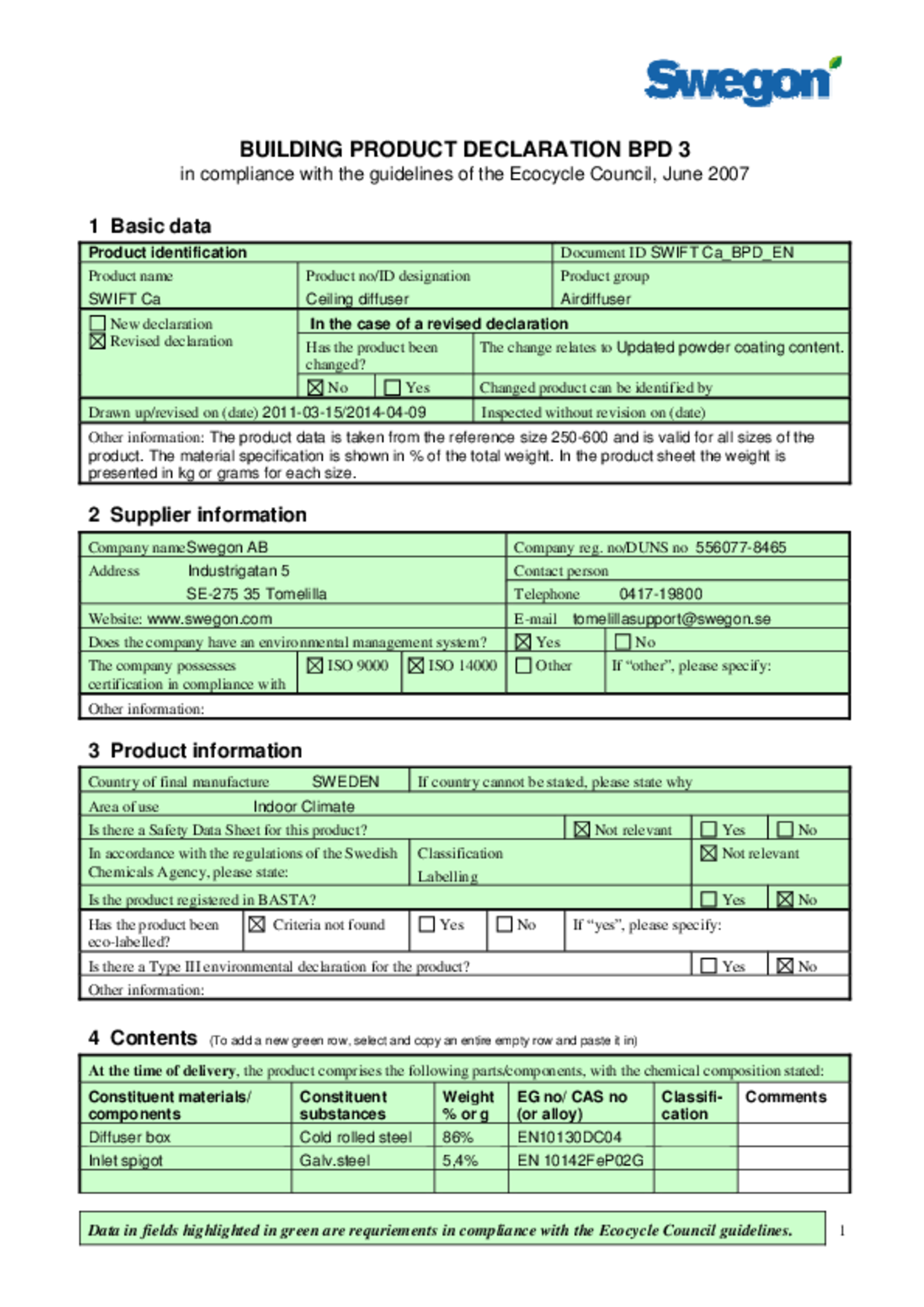| Building product declaration (pdf 42.1kB) | SWIFT Ceiling a | Laatuasiakirja | |