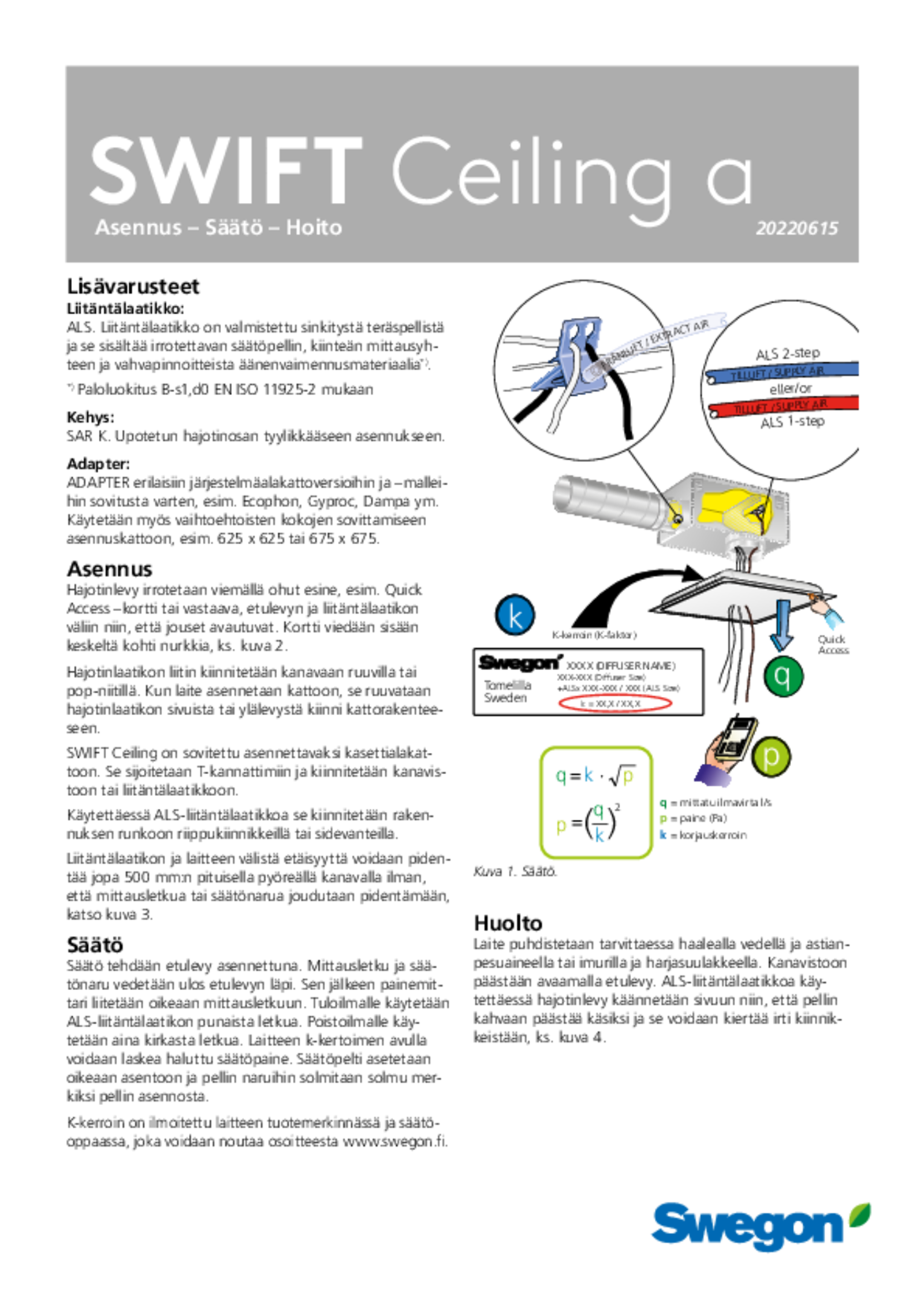 | Asennus, säätö, huolto (pdf 848.02kB) | SWIFT Ceiling a | Asennus- ja huoltomanuaali | |