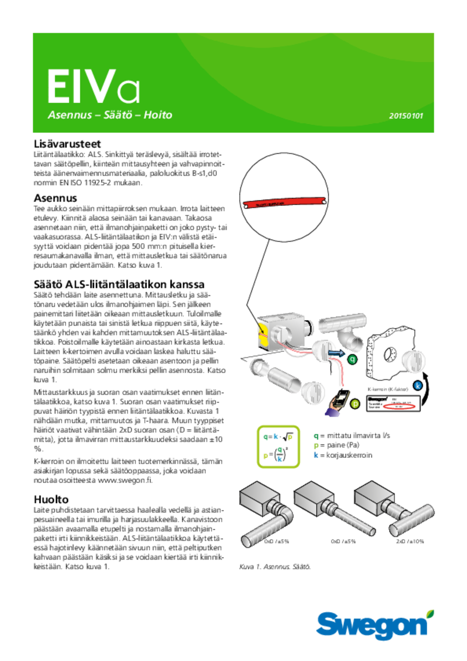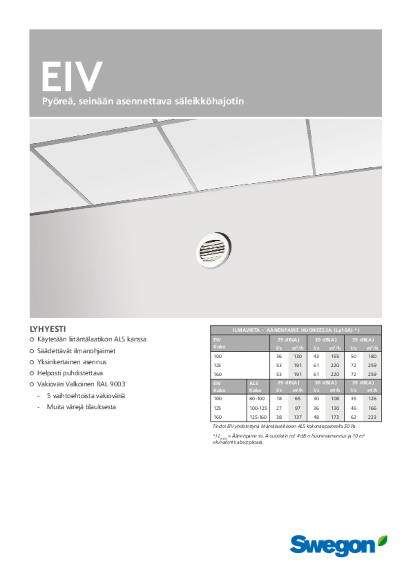 EIV on seinälle asennettava pyöreä säleikkö pyöreällä liitännällä. EIV:ssä on säädettävät ilmanohjaimet hajotuskuvion ja heittopituuden säätöä varten. EIV voidaan kiertää hajotuskuvion pysty- tai vaakasäätöä varten. Suosittelemme, että säleikköä käytetään yhdessä ALS-liitäntälaatikon kanssa.