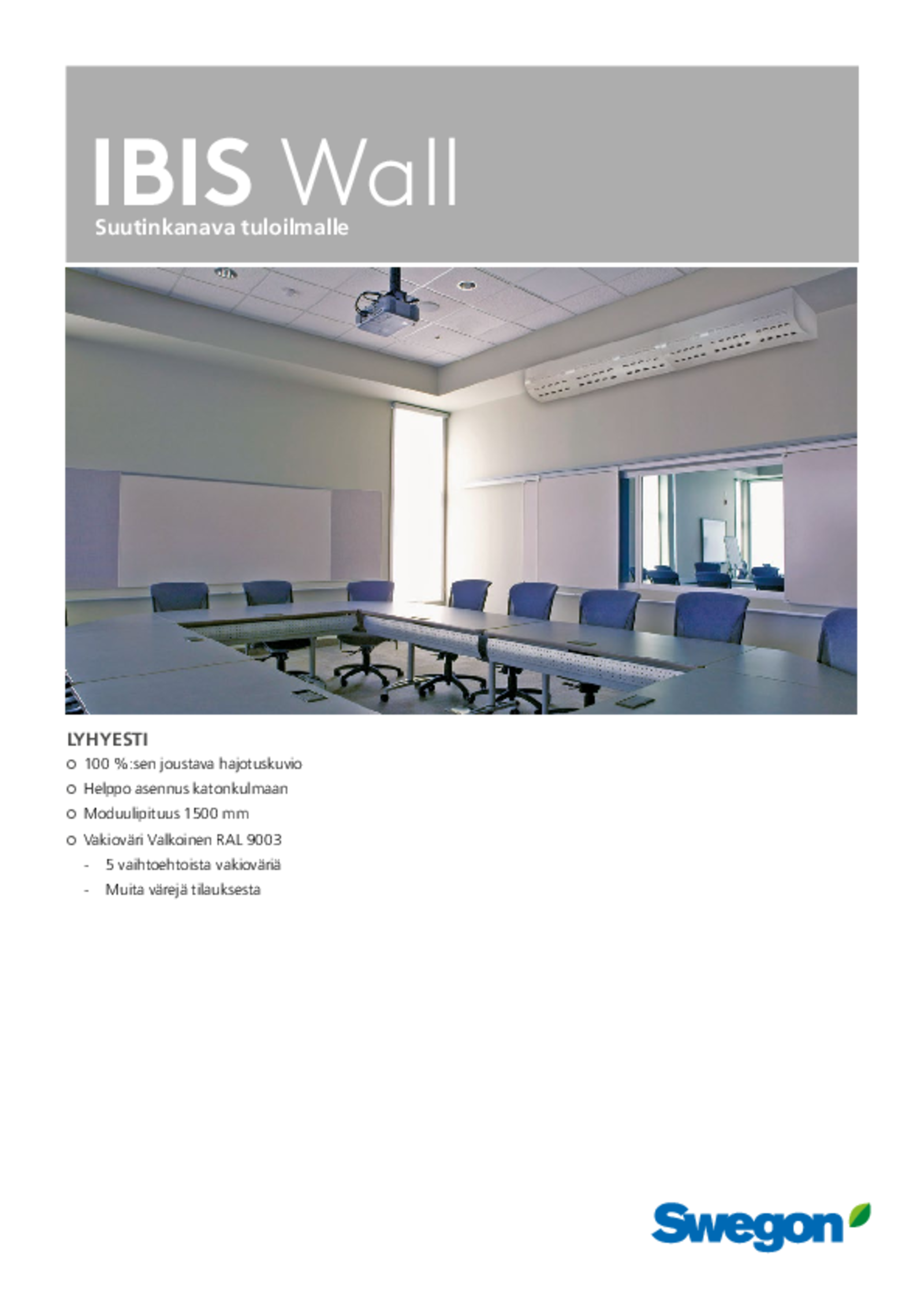 Suutinkanava Ibis Wall on tarkoitettu asennettavaksi katon kulmaan. Tuloilmalaitteessa on aerodynaamisesti muotoillut, kääntyvät suuttimet. Tuloilmalaitteessa on Ø200 mm liitännät päädyissä sekä rei'itys takasivulla.