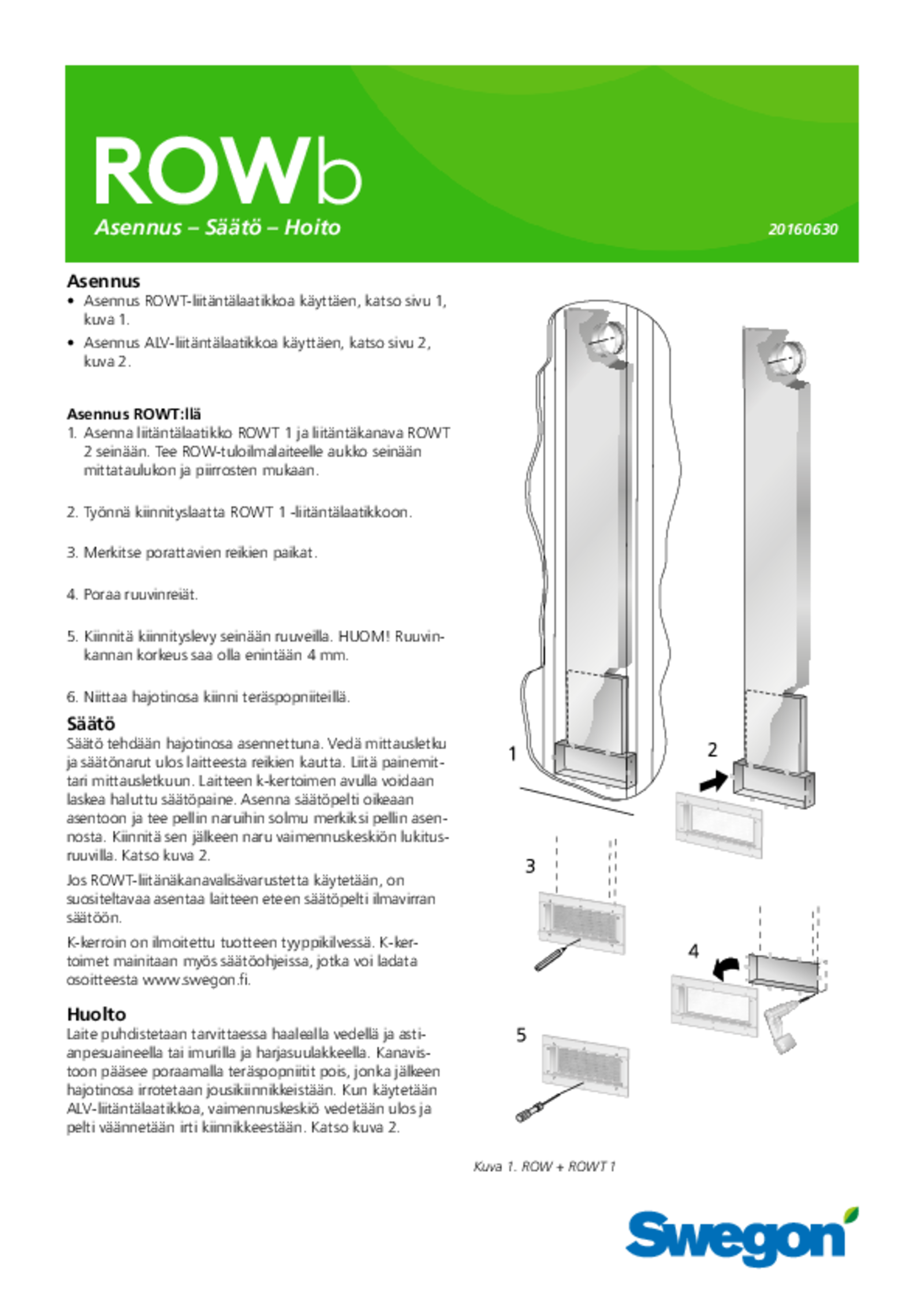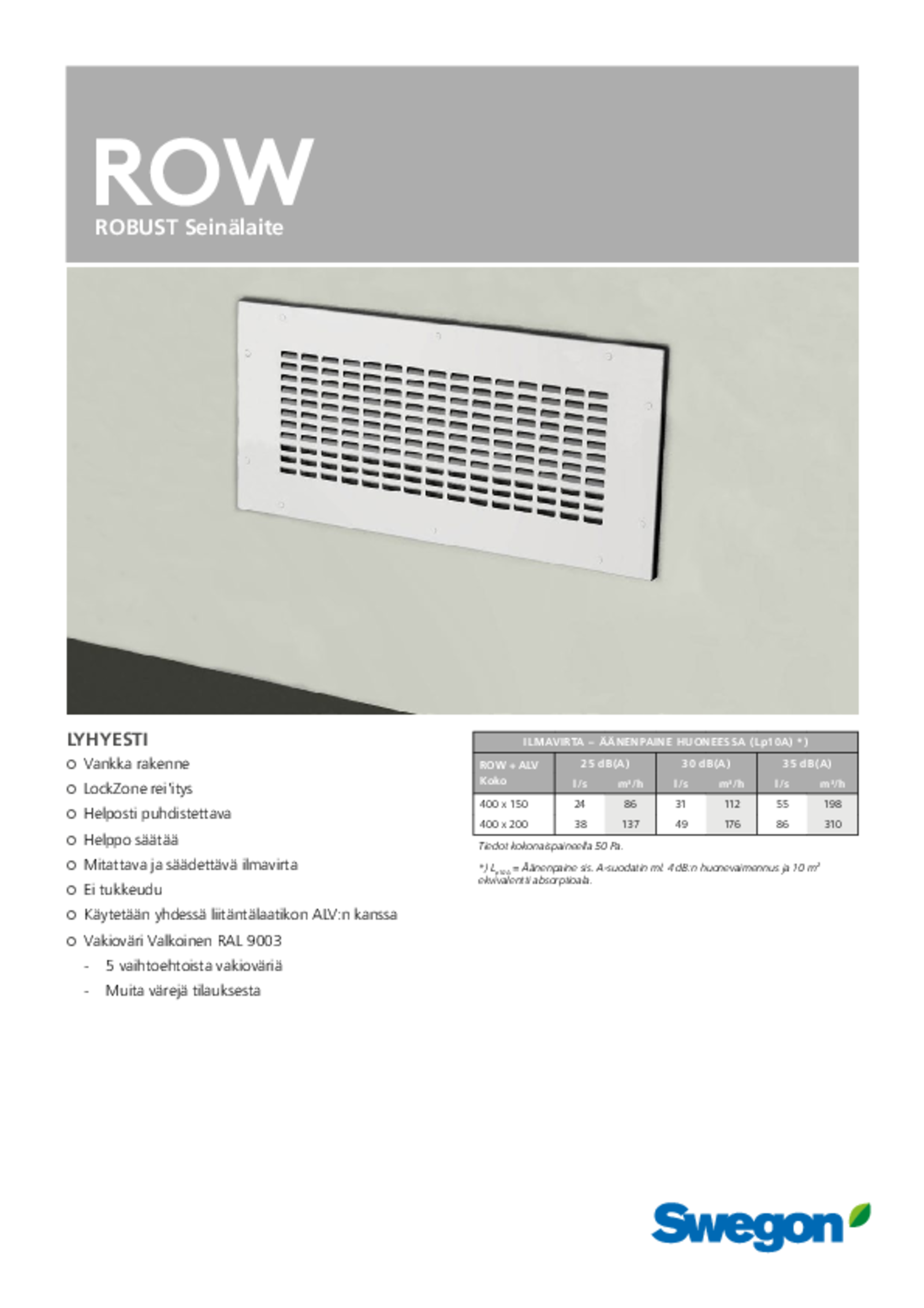 ROW on vahvistettu tuloilmalaite seinäasennukseen. Ilmanjakolaitetta voidaan käyttää vankiloissa, koulukodeissa, hoitolaitoksissa, kouluissa jne. Ilmanjako-osassa on rei’itetyt ohjaimet, jotka tuottavat hallitun hajotuskuvion ja upean ulkonäön. Sopii vakio- tai muuttuvaan ilmavirtaan. ROW-yksikköä voidaan käyttää myös syrjäyttävänä.