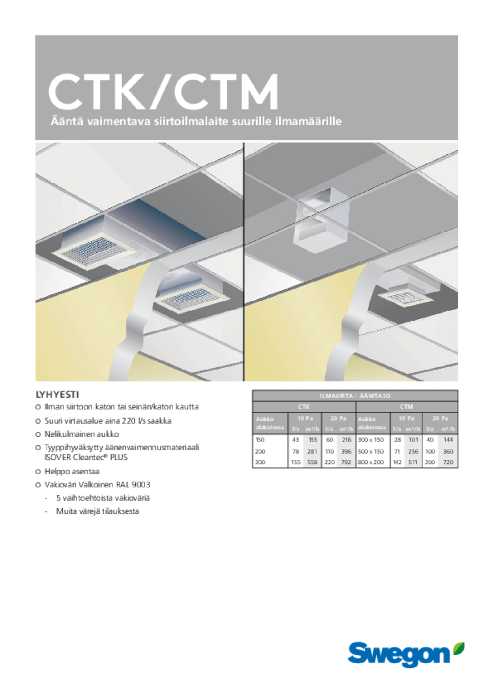 Siirtoilmayksiköt CTK ja CTM on kehitetty täyttämään huoneiden välisen äänenvaimennuksen kiristyneet vaatimukset. Pienen vapaan alan ja useiden kulmamuutosten yhdistelmä tuottaa erittäin hyvän äänenvaimennuksen pienellä painehäviöllä.