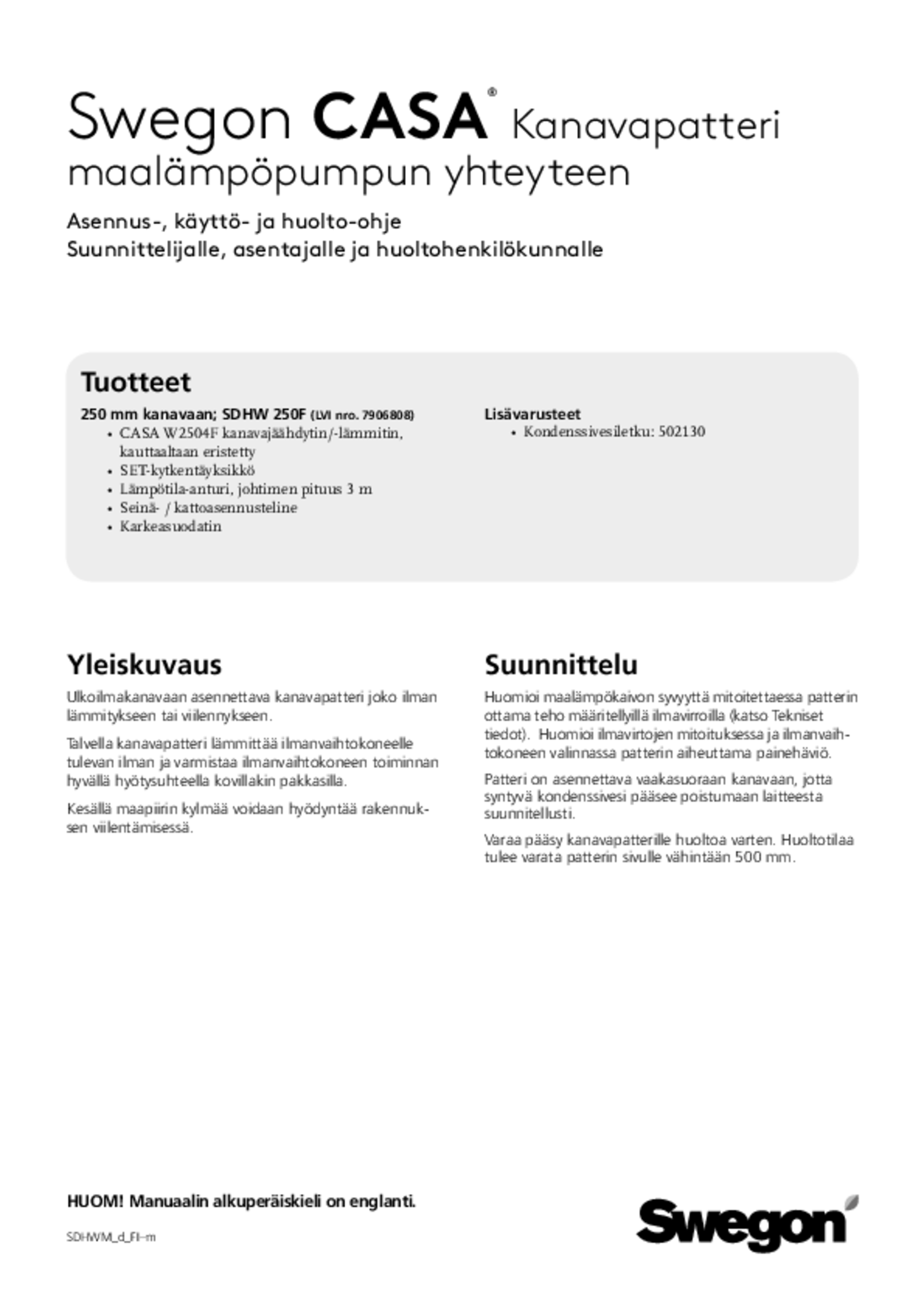 Maalämpöpumpulla varustetussa kiinteistössä voidaan käyttää ulkoilmakanavaan asennettavaa maaliuospatteria, joka sekä lämmittää sisään virtaava ilmaa talvella että viilentää sitä kesäisin. Kanavapatteri lämmittää sisäänotettavan ilman talvella varmistaen ilmanvaihtokoneen toiminnan hyvällä hyötysuhteella kovillakin pakkasilla. Kesällä maapiirin kylmää liuosta voidaan hyödyntää rakennuksen viilentämisessä. CASA -ohjaustekniikka mahdollistaa automaattisesti parhaan hyödyn kanavapatterista läpi vuoden.