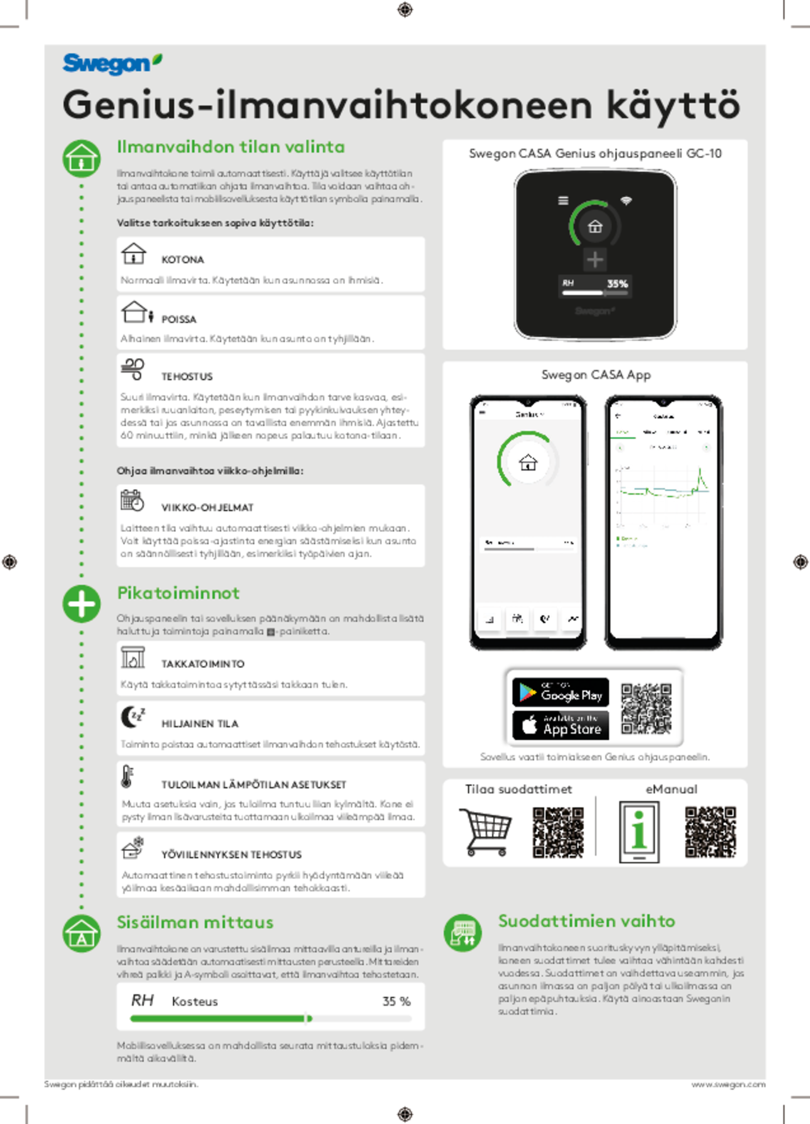Ilmanvaihtokonetta ohjataan käyttöpaneelilta ja mobiilisovelluksella (iOS/Android) ja se voidaan liittää taloautomaatiojärjestelmiin Modbusin avulla.