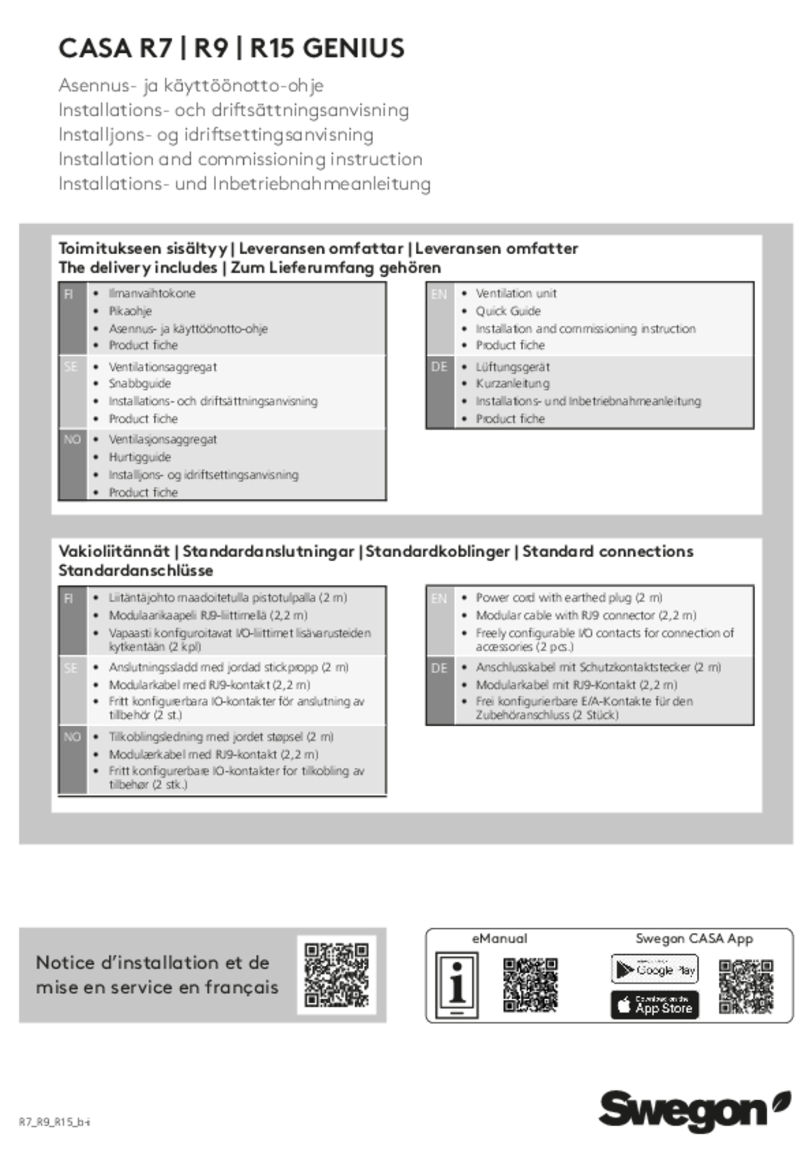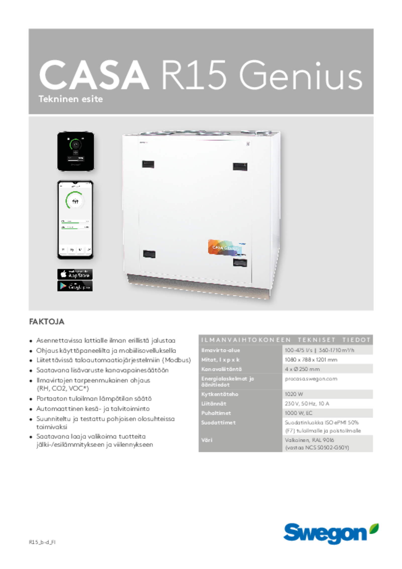 R15 on ilmanvaihtokone, joka soveltuu niin suurten asuntojen kuin toimitilojen tai kokoussalien ilmanvaihtoon.