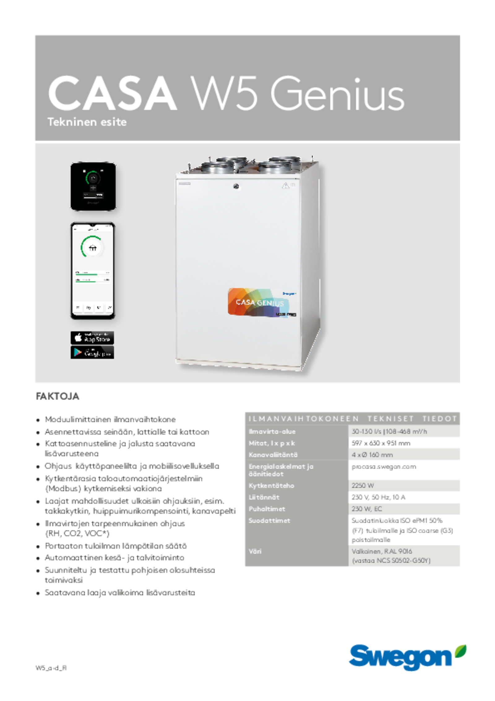 W5 on moduulimittainen ilmanvaihtokone, joka soveltuu seinä- tai kattoasennukseen kalusteiden yhteyteen.