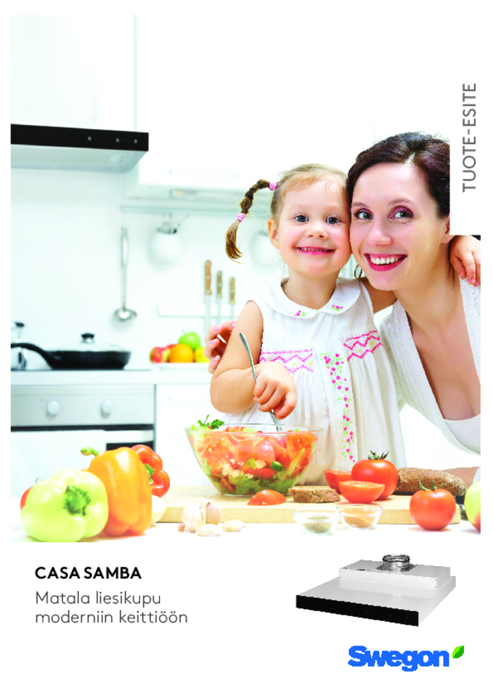 CASA SAMBA sopii moderniin keittiöön. Yhdessä ilmanvaihtojärjestelmän kanssa se takaa raikkaan sisäilman ja tasapainoisen ilmanvaihdon asunnossa. Korkea kärynsieppauskyky mahdollistaa tehokkään kärynpoiston alhaisemmilla ilmavirroilla, mikä puolestaan pienentää energiankulutusta ja luo vähemmän alipainetta ja ääntä. CASA SAMBA on matalarakenteinen liesikupu, joka sopii kaiken kokoisiin keittiökaapistoihin. Sileät pinnat ja pestävät metalliset rasvasuodattimet on helppo pitää puhtaana. Kupujen valaistuksena toimivat huoltovapaat LED-lamput, joiden valon voimakkuus on käyttäjän säädettävissä. Suojajännitteellinen liesikupu (24V) on varustettu pistorasiamuuntajalla, minkä ansiosta siinä on alhainen sähkönkulutus ja se on aina käyttäjälle turvallinen. Kaikki sähkökytkennät ovat kuvun päällä, jolloin ne ovat helppo ja nopea kytkeä asennusvaiheessa.